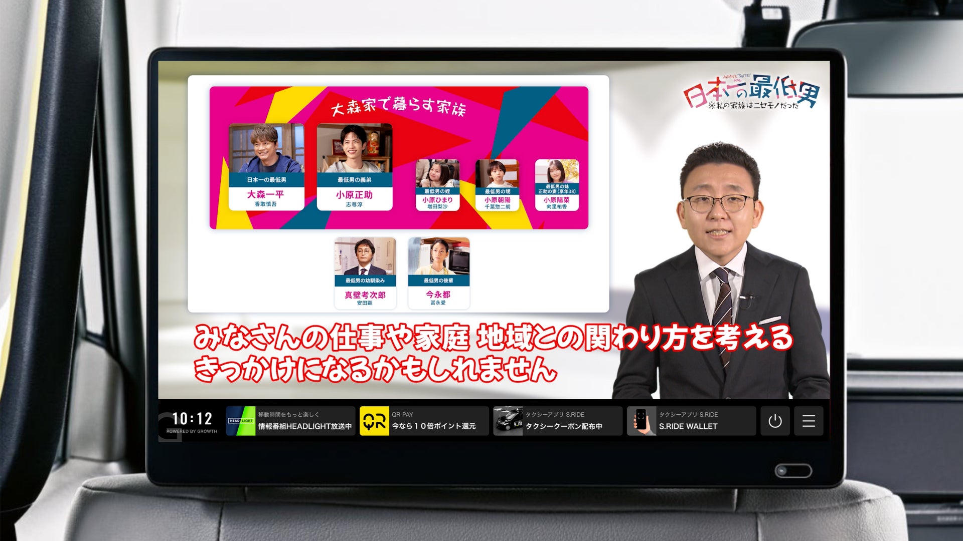 2025年1月9日(木)夜10時から放送をスタートするフジテレビの新ドラマ『日本一の最低男 ※私の家族はニセモノだった』とのコラボタクシーが、2025年1月6日(月)〜1月19日(日)の2週間限定で都内を走行します。コラボタクシーのうち、100台はタクシーの車窓に主演の香取慎吾さん・志尊淳さん・冨永愛さん・増田梨沙さん・千葉惣二朗さんが登場し、2台はドラマ仕様の特別ラッピング車両が走行します。本コラボタクシーは、タクシーアプリ「S.RIDE」で指定配車が可能であり、車内のタクシーサイネージメディア「GROWTH」では、フジテレビアナウンサーの上垣 皓太朗アナウンサーがレポーターとして特別出演し、ドラマのスタートを独自の解説で盛り上げます。