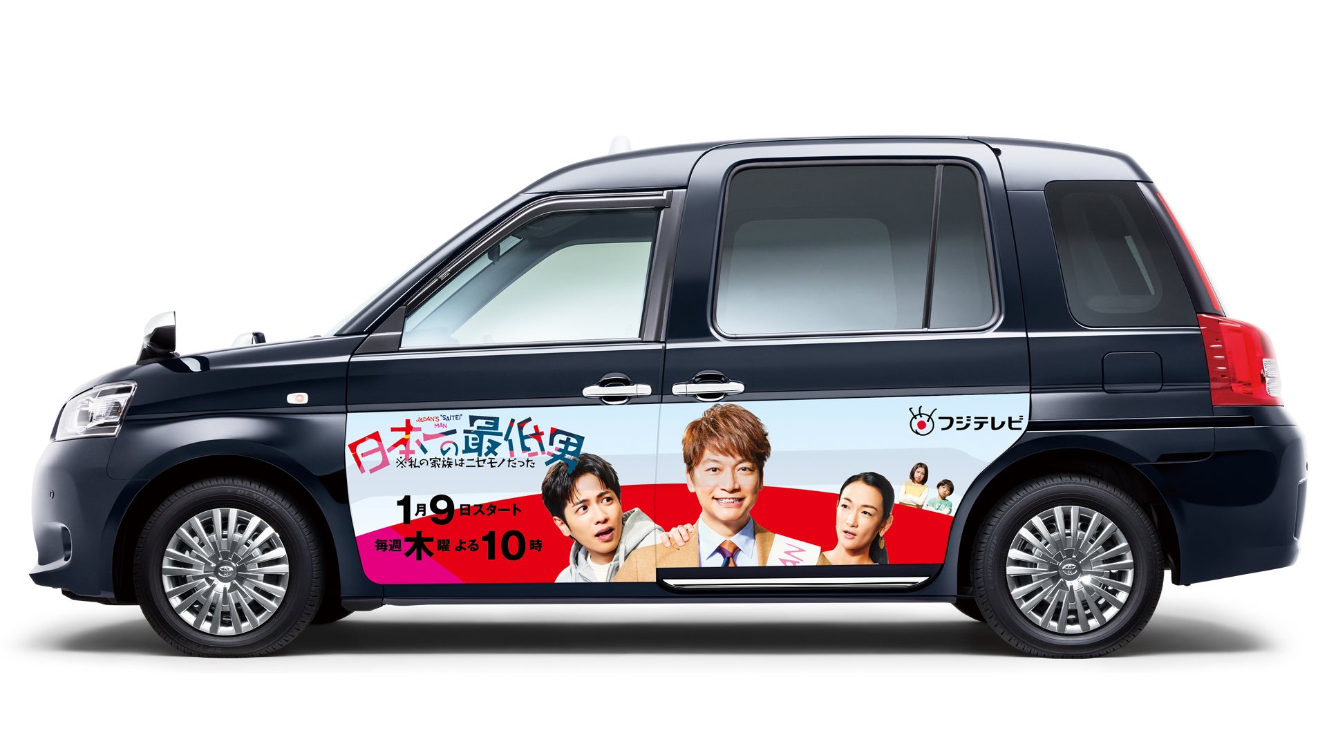 【タクシーの車窓に香取慎吾さん・志尊淳さん・冨永愛さんが登場?!】フジテレビ新ドラマ『日本一の最低男 ※私の家族はニセモノだった』コラボタクシーが走行