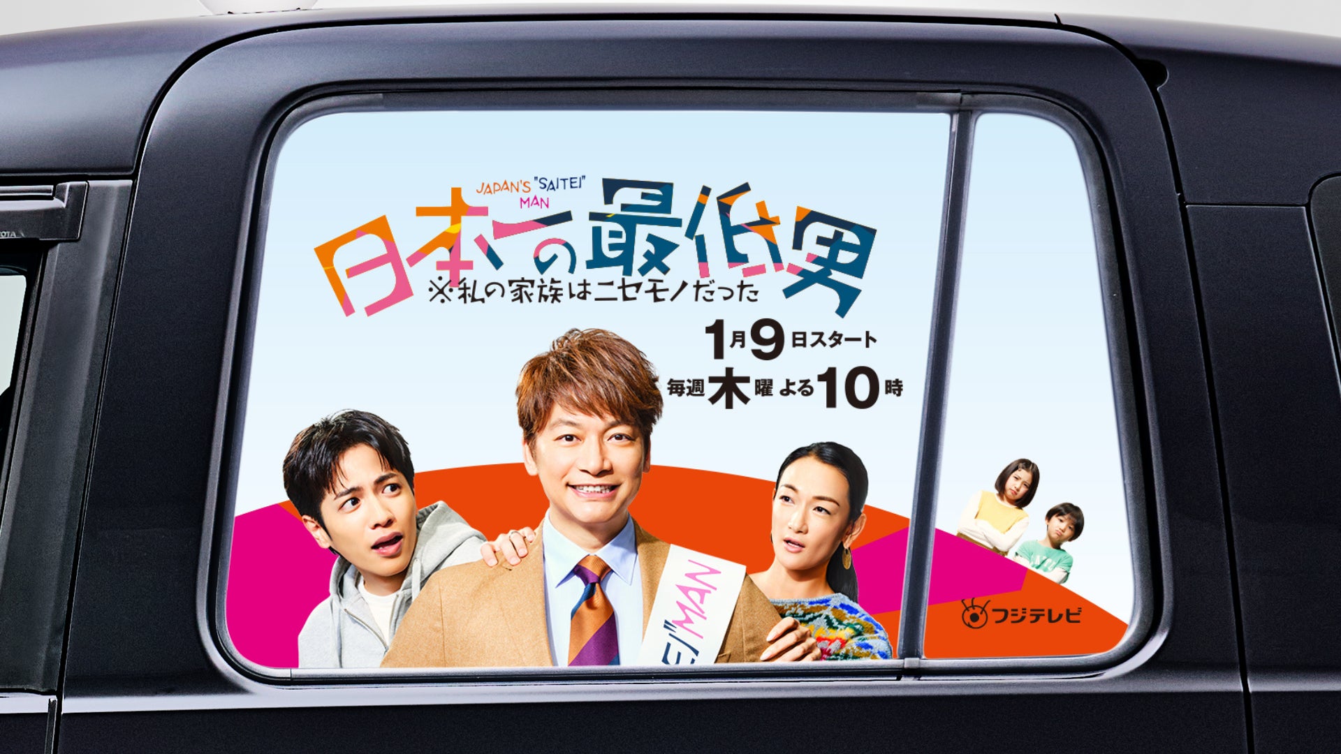 車窓には主要キャスト陣が登場!フジテレビの新ドラマ『日本一の最低男 ※私の家族はニセモノだった』コラボタクシーが走行