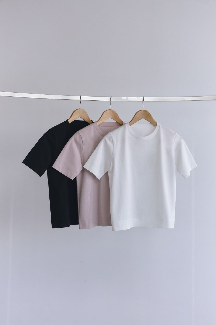 ANAYIが提案するのは、ベーシックな T シャツ、ニュアンス使いができるドロップショルダー、コンパクトなノースリーブの全3型。