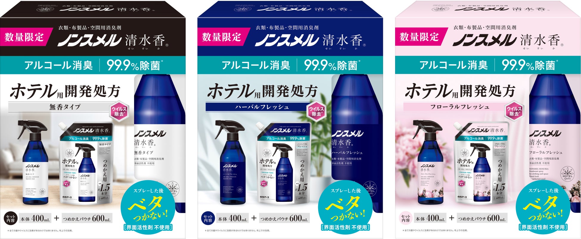 白元アース株式会社(本社:東京都足立区、社長:吉村一人)は、ホテルクオリティの衣類・布製品・空間用消臭剤「ノンスメル清水香(せいすいか)」の『本体・つめかえパウチセット』を11月5日より数量限定発売いたします。