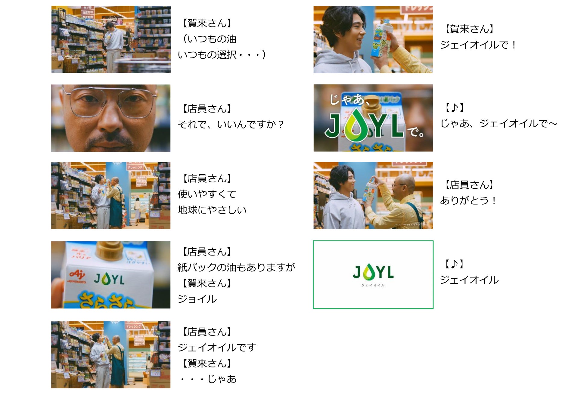 スーパーマーケットの食用油売り場で、「いつもの油、いつもの選択」と言いながら何気なく食用油を選び手に取る賀来さん。そこに突如現れた店員さんから「使いやすく地球にやさしい紙パックの油もありますが」と便利で地球にやさしい紙パックの食用油「スマートグリーンパックⓇ」シリーズを、強烈に薦められる賀来さん。差し出された商品パッケージのJOYLロゴを「ジョイル」と読み間違え、店員さんに「ジェイオイルです」と訂正された賀来さんは、納得した感じで「じゃあ、JOYLで。」と嬉しそうに「スマートグリーンパックⓇ」シリーズを選びます。それに対して店員さんが「スマートグリーンパックⓇ」シリーズの容器が話しているようなコミカルな仕草で、賀来さんに選んでくれてありがとうと伝えます。