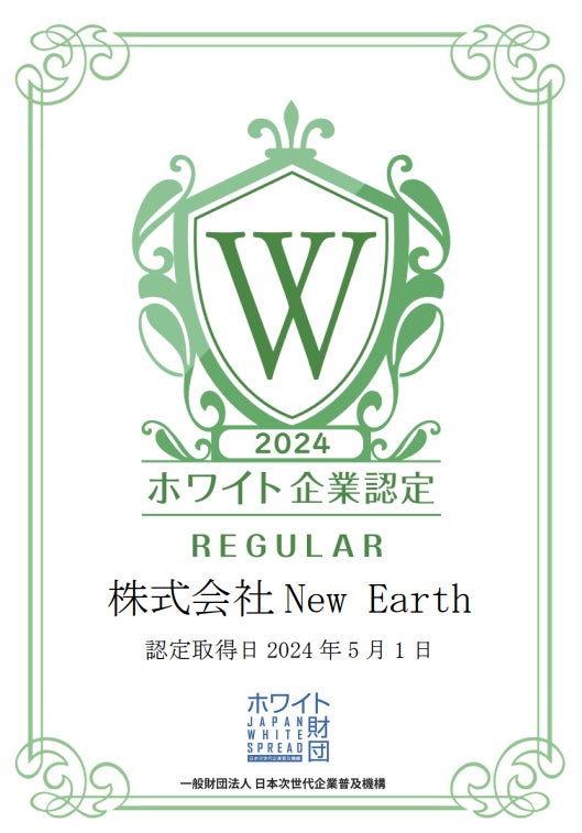 株式会社New Earth様が、一般財団法人日本次世代企業普及機構(通称:ホワイト財団)が運営する「ホワイト企業認定 レギュラーランク」を取得しましたことをお知らせいたします。