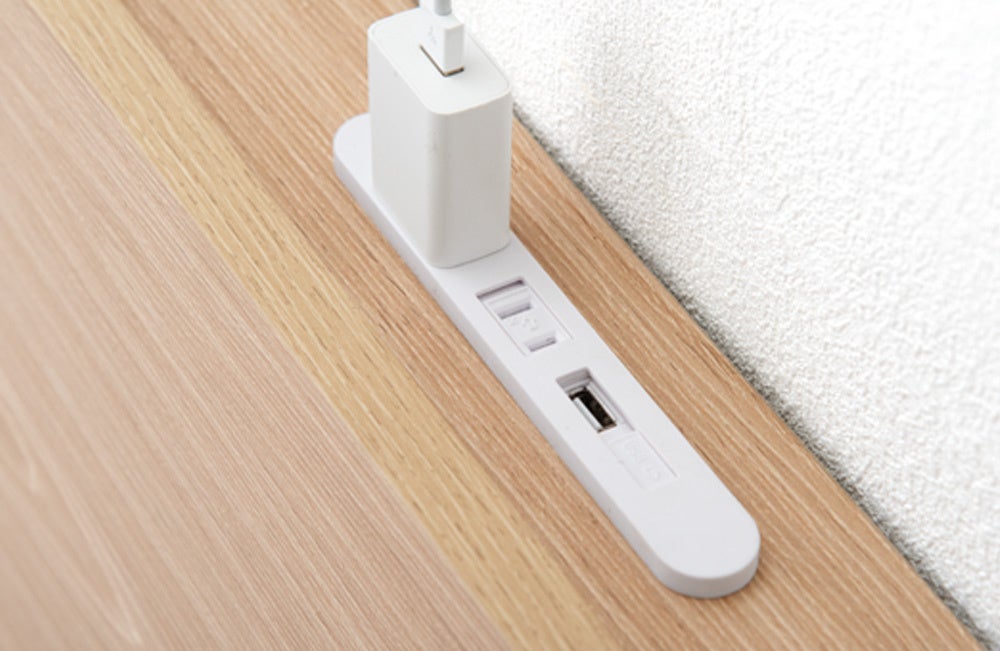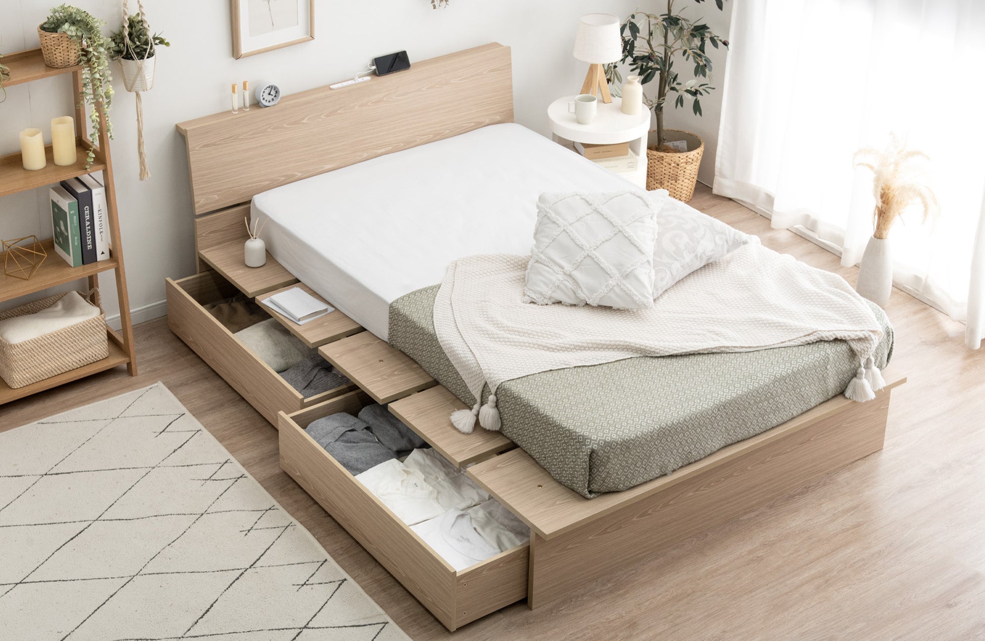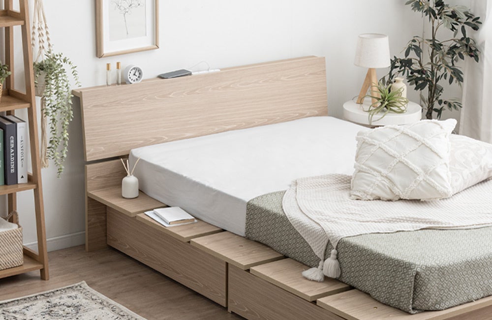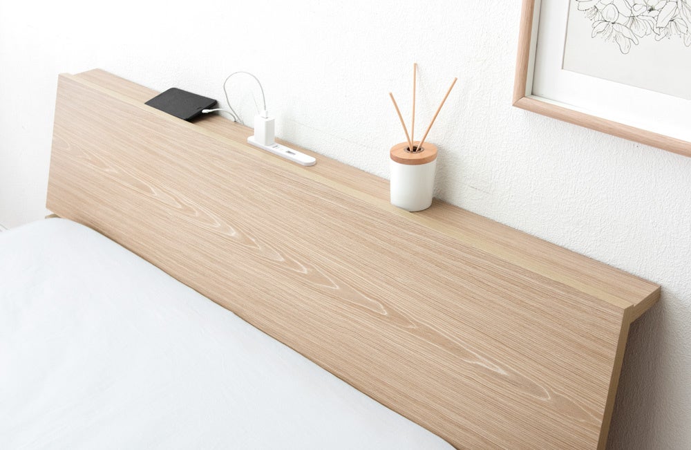 収納付きステージベッドはスマートフォンやメガネ・インテリア小物などを置くことができる宮棚付きとなっています。宮棚にはUSBポートと2口コンセントを装備しており、就寝中やベッドの上でもスマートフォンやそれ以外の電子機器類を充電しながら操作することができます。