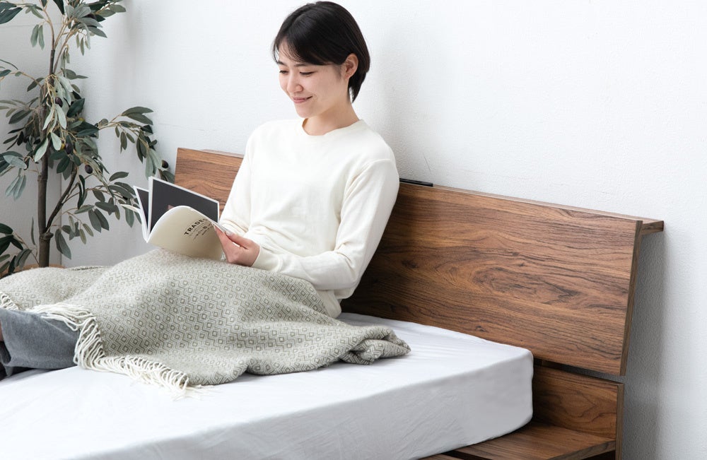 また、ヘッドボードは傾斜のある背もたれとなっており、角度が付いているので読書やスマホ・PC作業をする際にも寄りかかりながらくつろぐことが可能です。