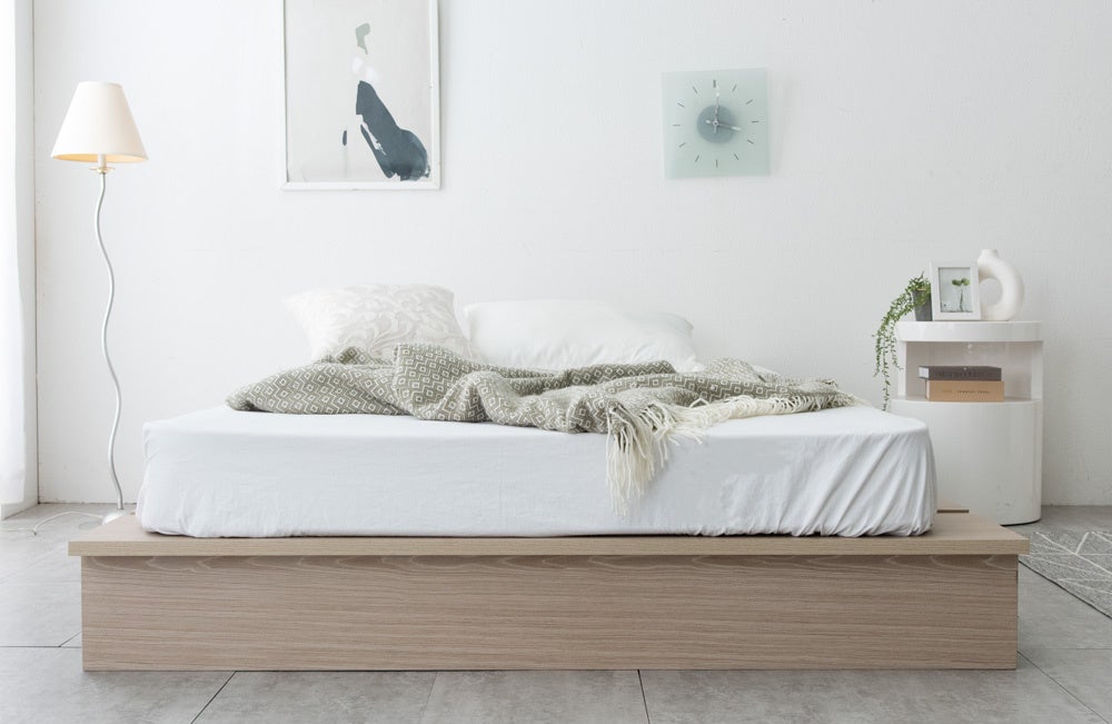 マットレス周りのサイドフレームのゆとりが全体的なデザインのポイントとなり、お部屋を広く見せられることやマットレスの大きさ次第でお部屋の雰囲気を変えられることで人気のベッドフレームとなっています。