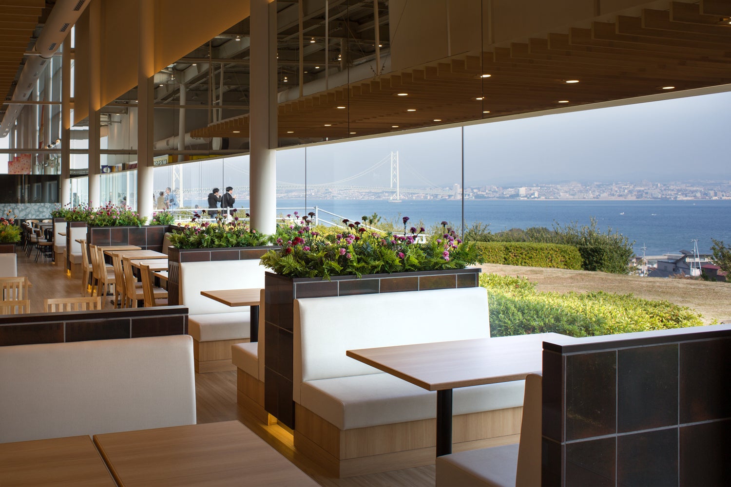淡路サービスエリア(SA)下り線内レストラン「ロイヤル」の広々とした客席からは、雄大な明石海峡の大パノラマが広がります。特に窓際席からの景観は抜群で、まさに絶景が目の前に広がります。レストラン・フ一ドコ一ト・売店・道路案内所・展望テラスなどがあり、ゆっくりとくつろぐことができます。