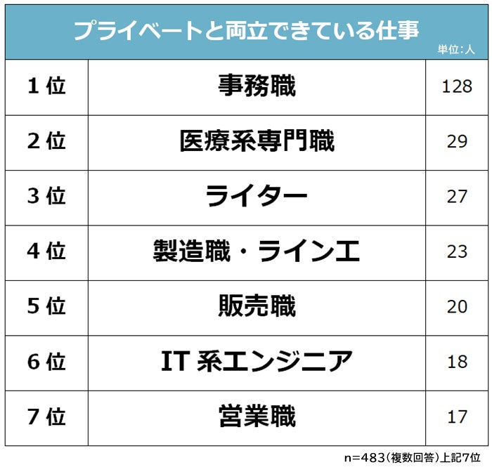 仕事とプライベートを両立できている483人に「何の仕事」をしているか聞いたところ、圧倒的1位は「事務職(128人)」でした。