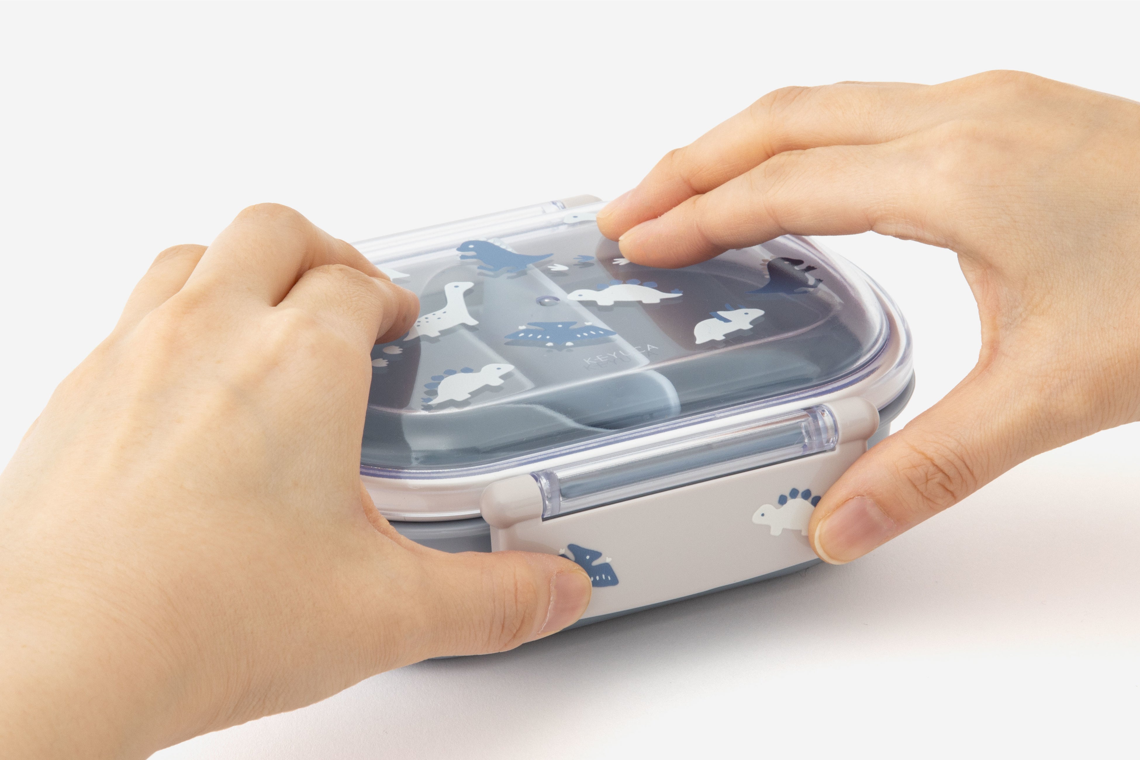 お弁当デビューにおすすめの小ぶりなサイズのお弁当箱です。通園や遠足に便利なお名前シール付きで、さらに嬉しい抗菌機能も付いています。お子様が自分で楽しくお片づけができるように、フタの止具には、チョウチョとお花や、恐竜のイラストがあります。両側止具のイラストを押すとパチッとフタが閉まるので、フタの閉じ方を教えるときの目印としてお使いください。マットな質感と落ち着きのある色味で、他のアイテムと揃えるのもおすすめです。