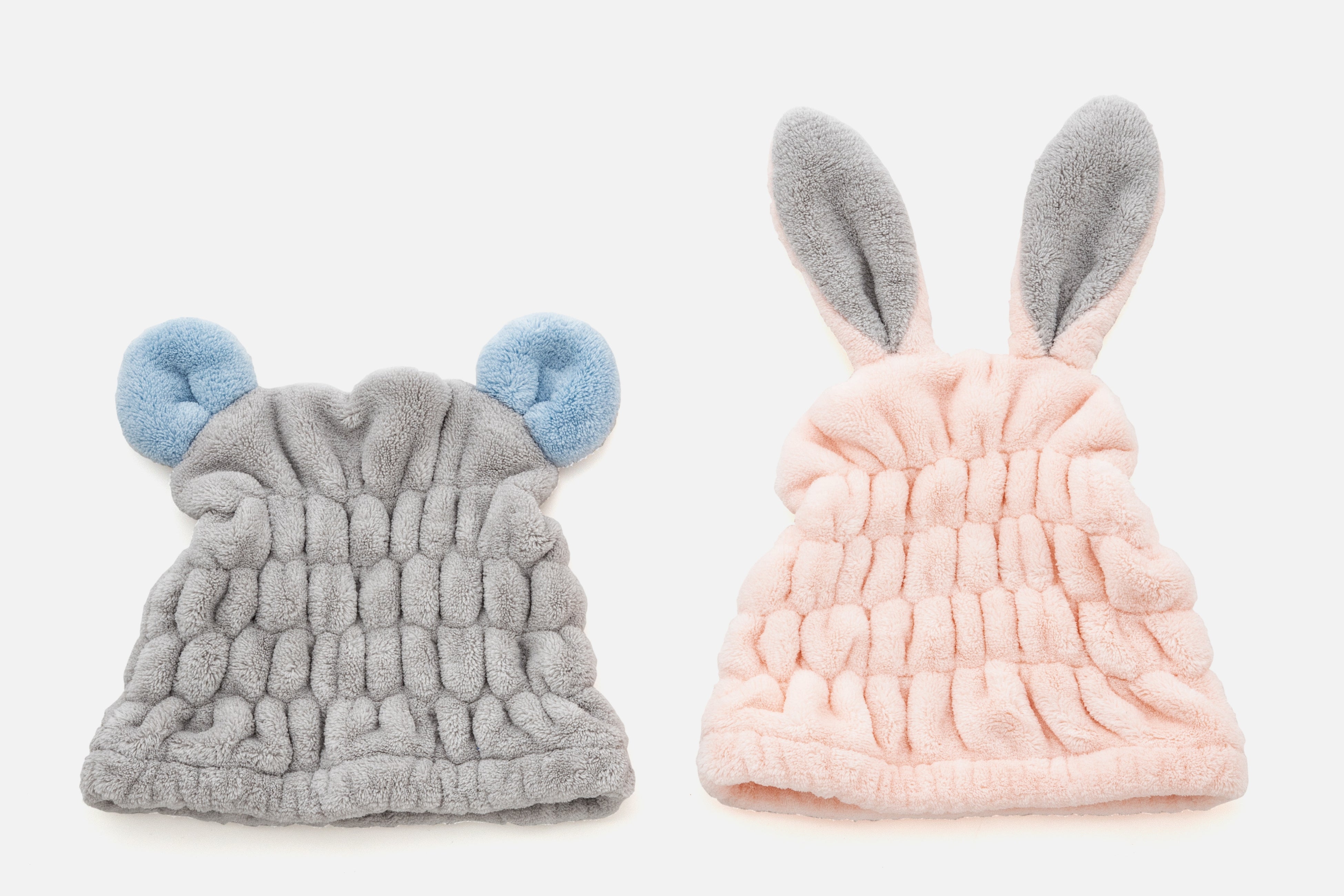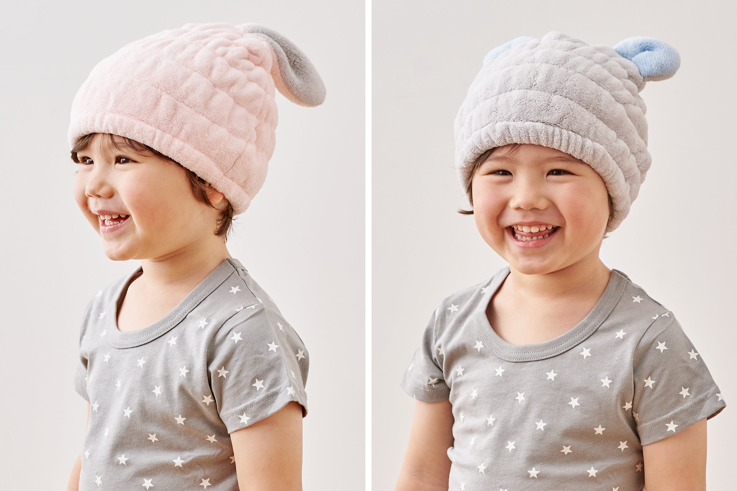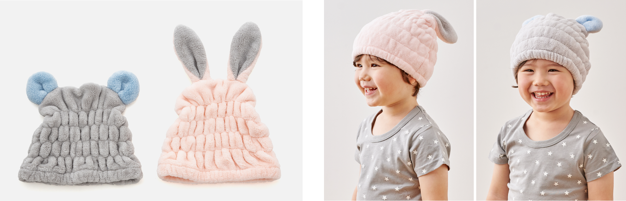 - ウサギとクマの耳付きのデザインで見た目も可愛く!「吸水乾キッズヘアキャップ」商品概要