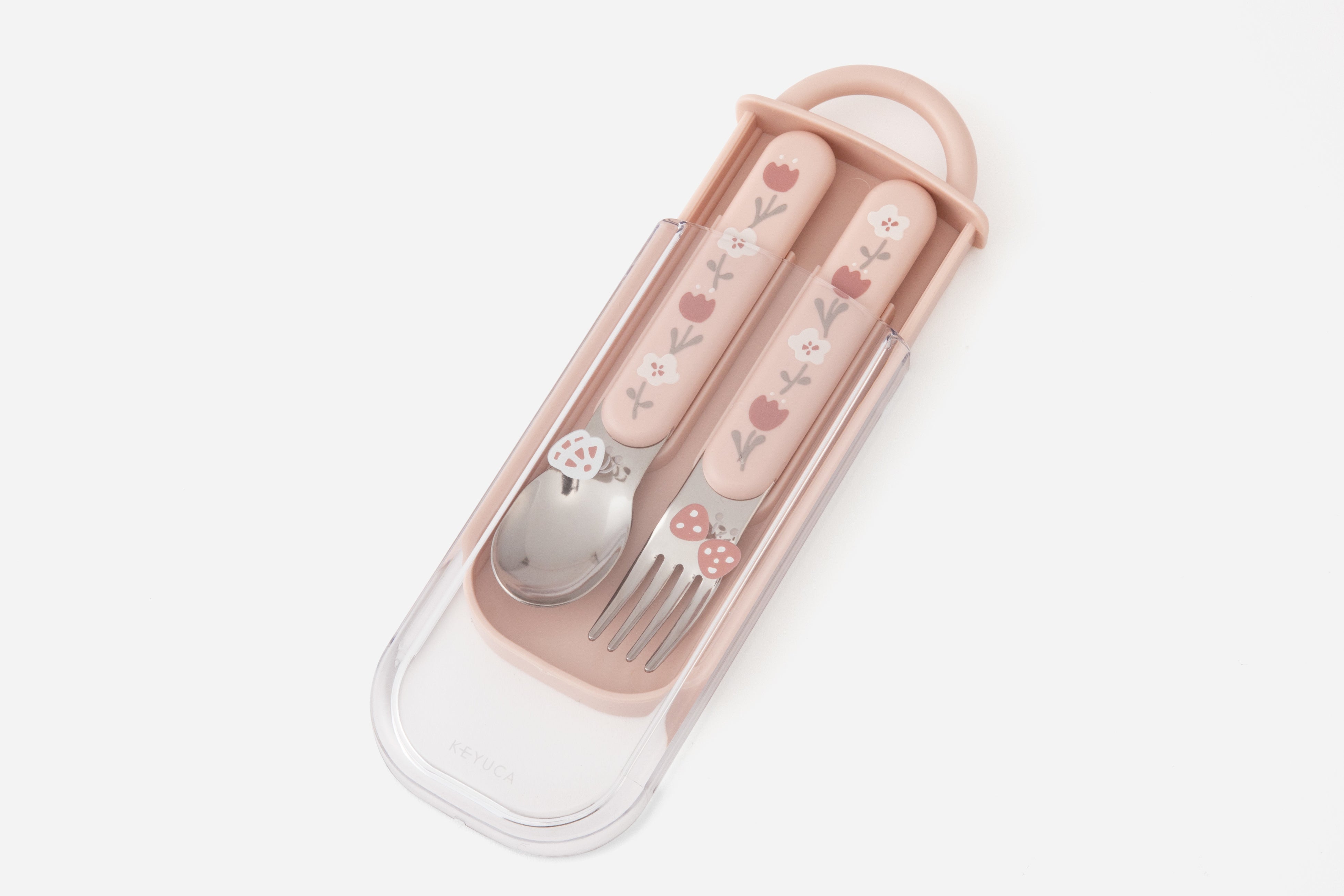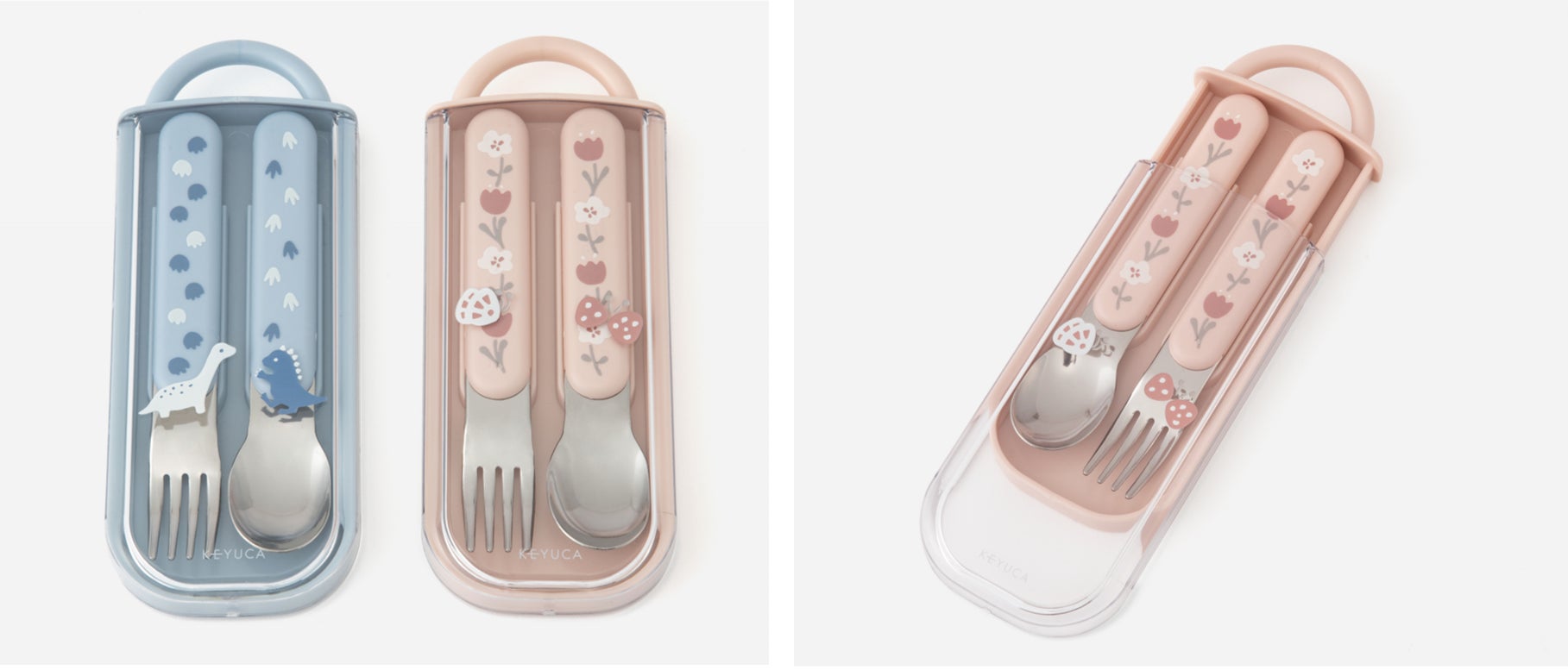 お弁当と一緒に揃えたいスプーンとフォークのカトラリーセット。コンパクトなサイズ感で、持ち運ぶときにかさばりません。これも、ケースや柄の樹脂部分に抗菌機能が付いています。指で引き出すスライド式のケースには、フタにチョウチョと恐竜の目印があるのがポイント。スプーン・フォークを入れた状態でカチッとフタを完全に閉めると、チョウチョがお花にとまる様子や、トコトコ歩いてきた恐竜たちが出会った様子が見られます。食べ終わった後も、お子様が自分で楽しくお片づけができるように、親子で一緒に確認しながら使ってみてください。