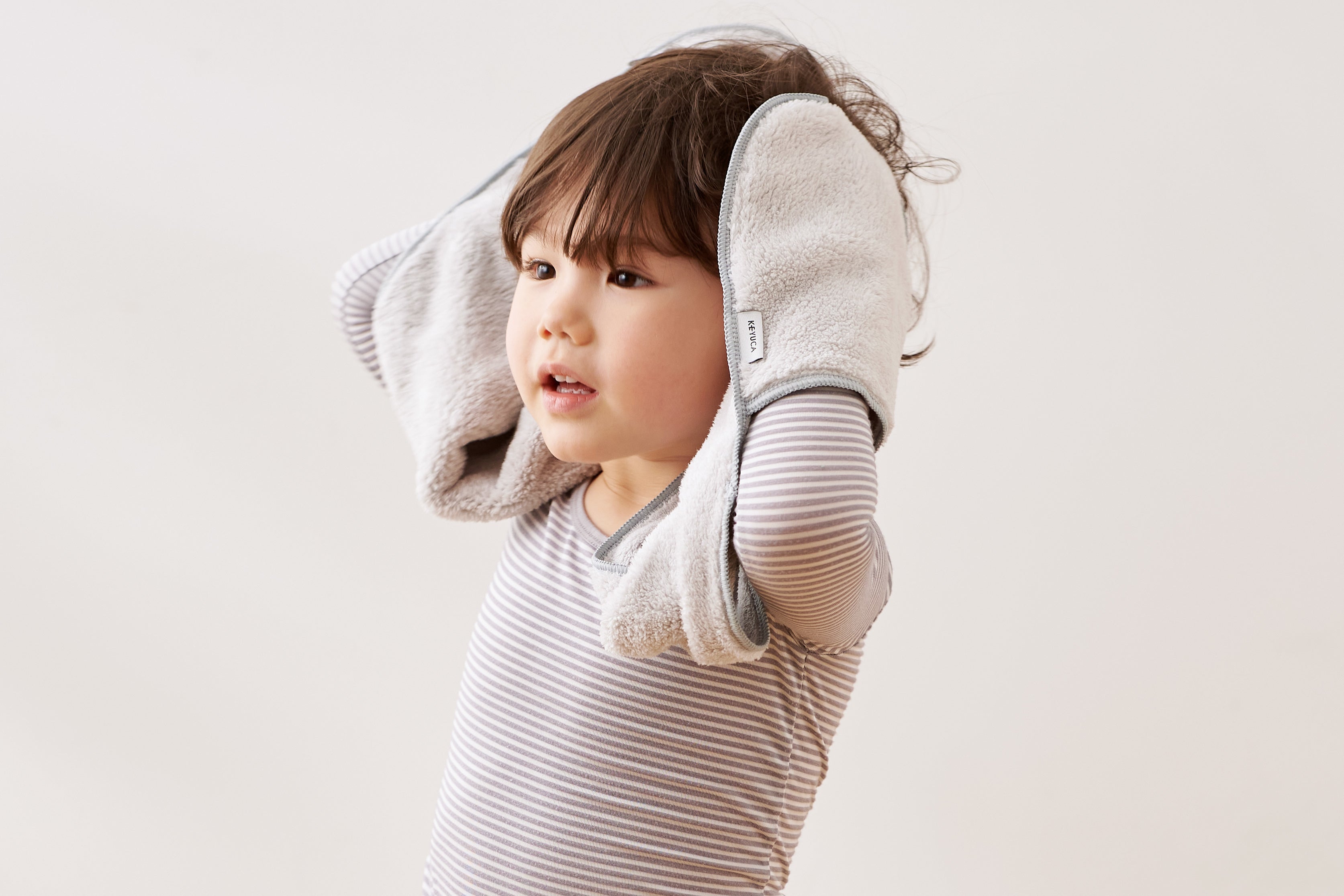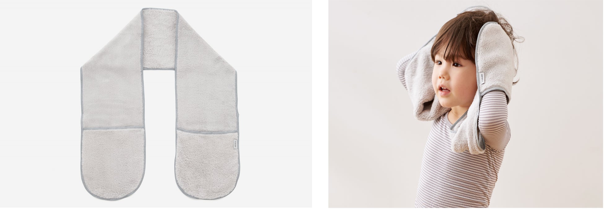 子どもが自分で身体や髪の毛を拭く練習ができる、子どもの自立心をサポートするタオルが新登場。マフラー型で両脇にポケットが付いているため、ポケットに手を入れると小さなお子様でもタオルを落とさずに拭くことができます。また、ふわふわのマイクロファイバー素材は、綿の約3倍の吸水量で、優しく身体にあてるだけで、水分をさらっと吸収してくれます。さらに、自然乾燥で乾きやすいため、毎日使いにも便利です。ぜひ多くのご家庭で使っていただきたいという想いから、お求めやすい価格設定にしました。