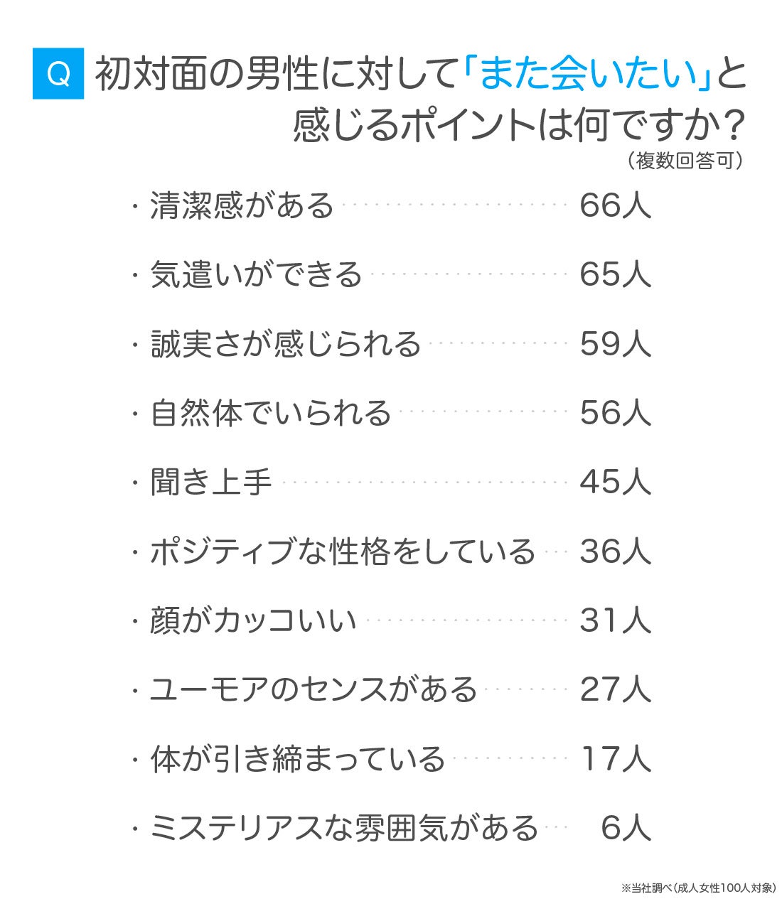成人女性100人に「初対面の男性に対して『また会いたい』と感じるポイントは何ですか?(複数回答可)」と尋ねたところ、「清潔感がある」「気遣いができる」「誠実さが感じられる」が上位となりました。