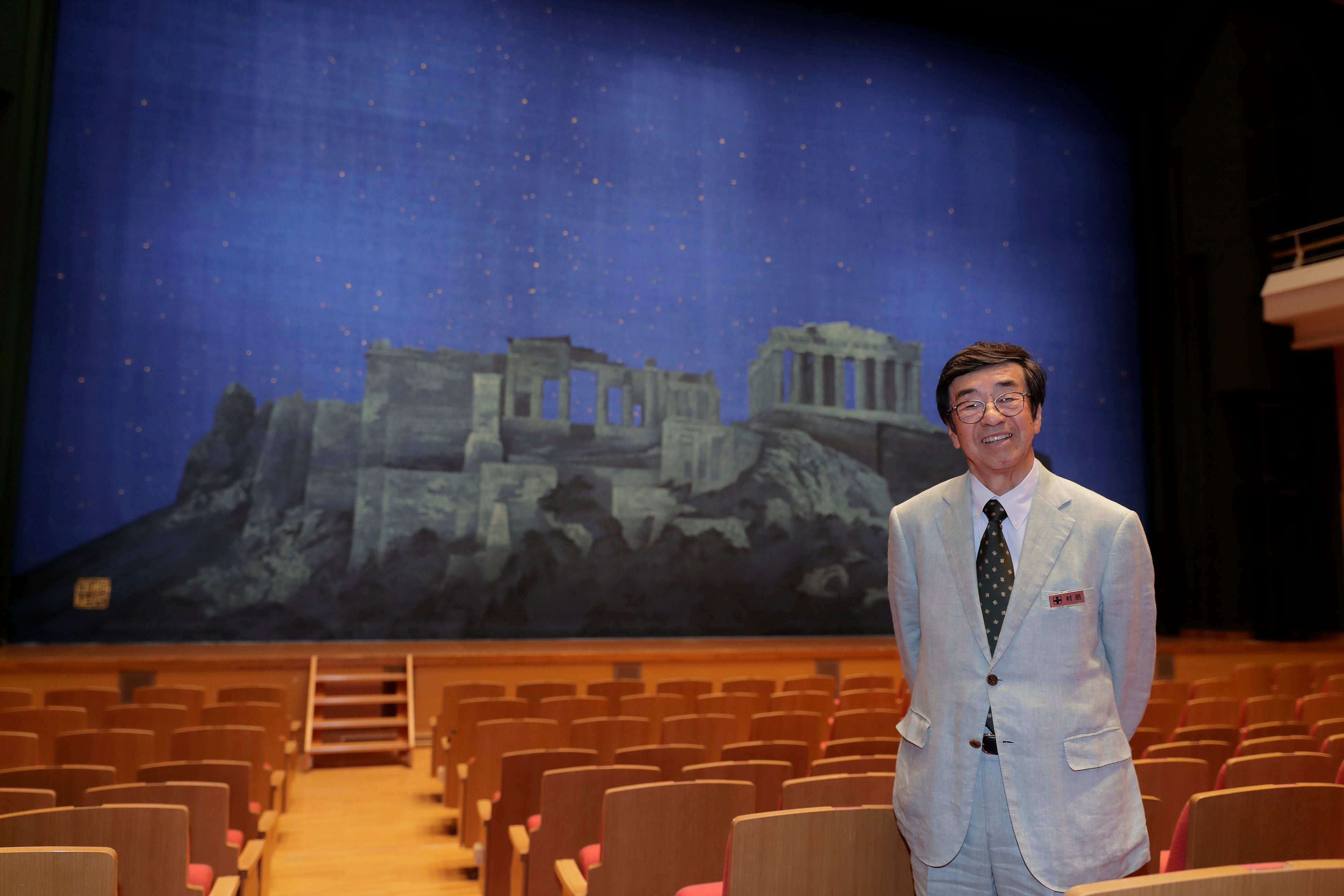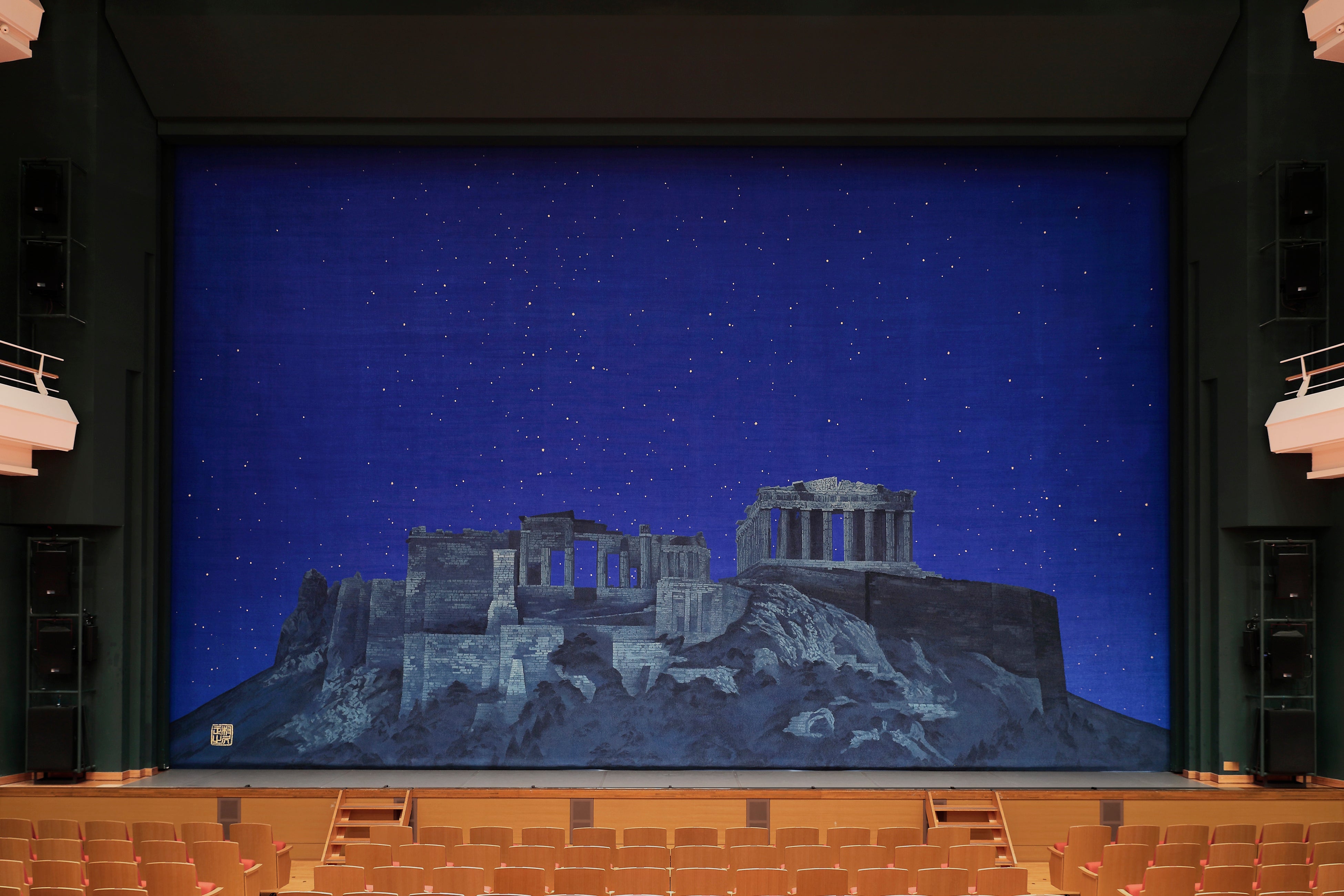 その原画を京都の織物メーカー川島織物セルコンが伝統の織技術によって幅16.5m×高さ10.5mの緞帳へと織り上げました。劇場でライティングが施されると、重厚感ある遺跡が立ちあがり、星夜にギリシャの円形劇場からアクロポリスを臨んでいるかのよう。