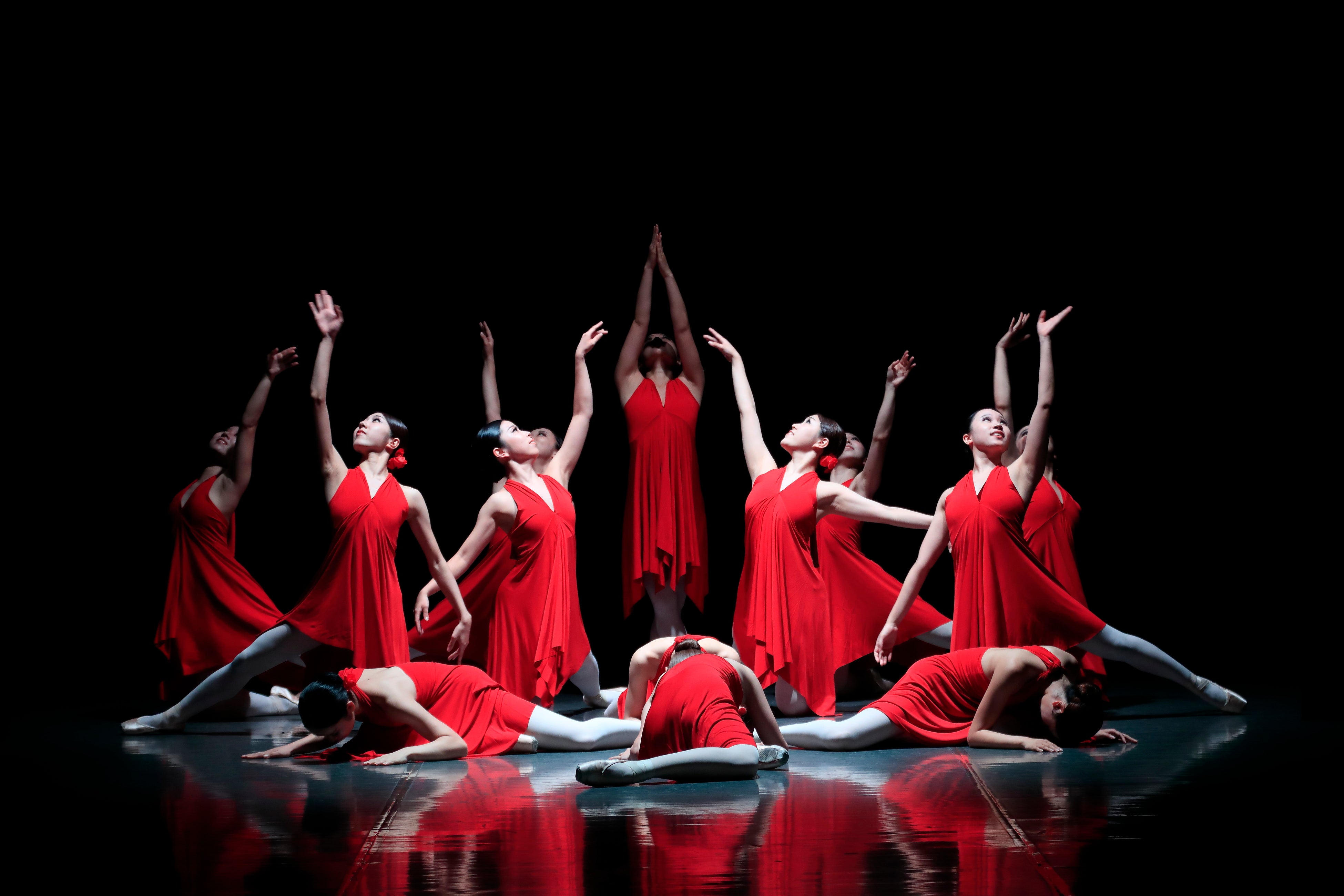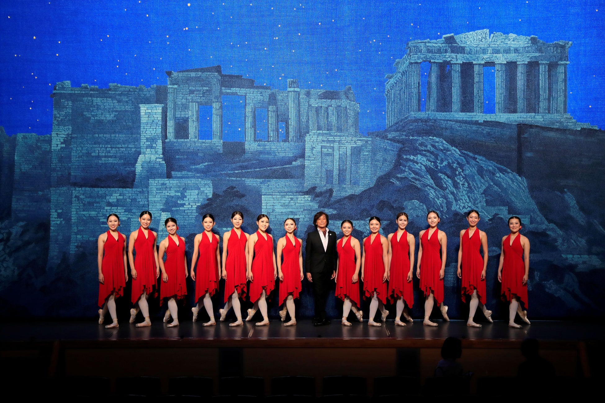 プログラムの最後には堀内充教授が今回のために振り付けた新作バレエ「ローザス」が祝舞として奉納されました。深紅の衣装を纏った13名の舞踊コース学生一人ひとりがローズ=バラになって、新緞帳を囲むイメージで新たな劇場のスタートを彩りました。
