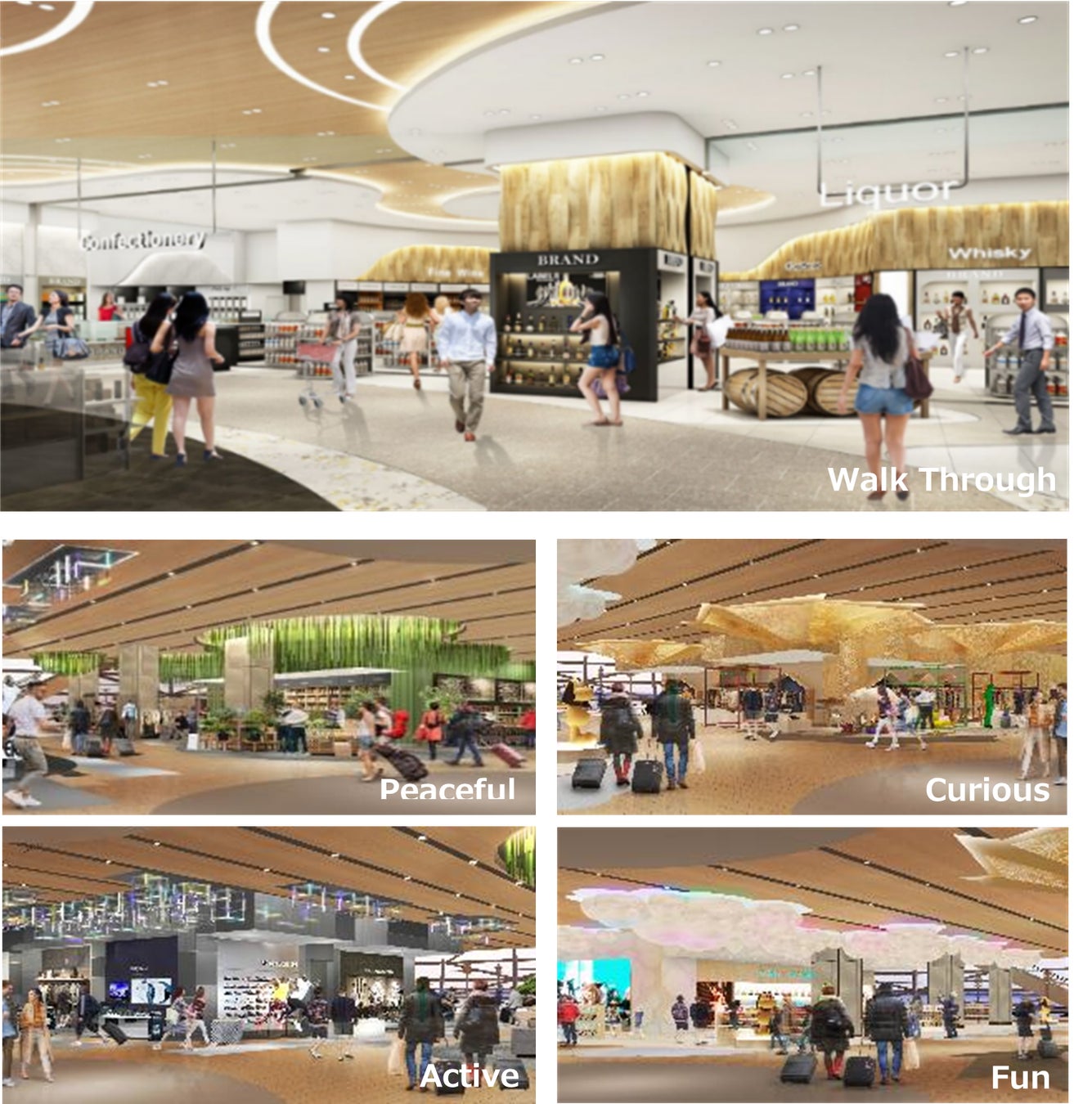 新しい国際線出発エリアは、ウォークスルー型の免税店の他、新たなコンセプトとなる中央のプラザエリアと4つのMoodエリアを展開し、ご利用のお客さまに新たな旅の体験をご提供します。Moodエリアは雰囲気の異なる4つのエリアで構成され、その雰囲気に合ったデザインや店舗を配置しており、お客さまの気分に合わせて楽しんでいただける空間を作っています。
