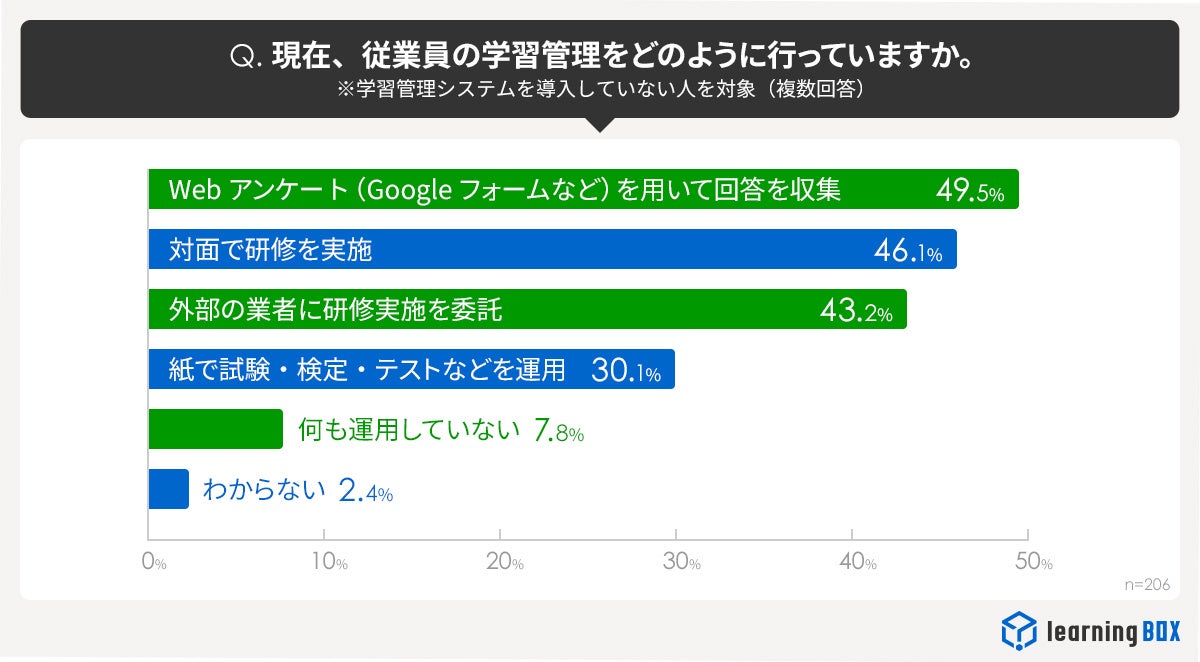 学習管理システム(LMS)を導入していない企業のうち、46.1%が「対面で研修を実施」と回答。また、「紙で試験・検定・テストを運用」「何も運用していない」との回答が合計37.9%を占めるなど、多くの企業がいまだデジタル活用に踏み切れていない現状が明らかになりました。