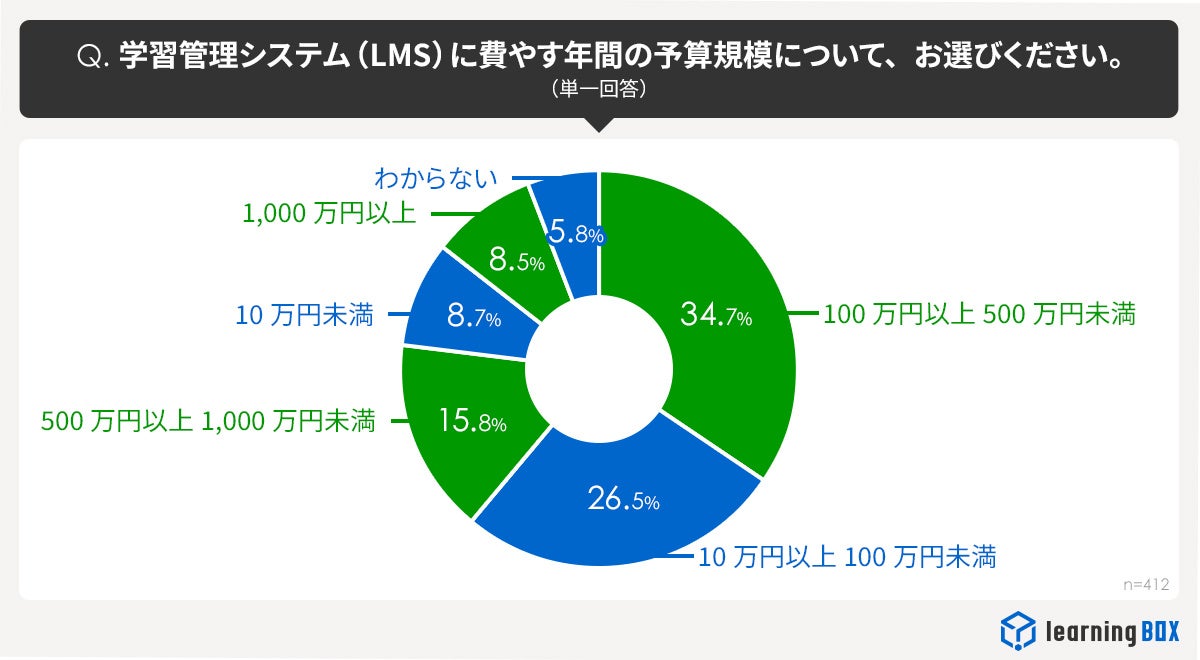 学習管理システム(LMS)における年間の予算規模では、「100万円以上500万円未満(34.7%)」「10万円以上100万円未満(26.5%)」が全体の6割を占めました。複数のクラウドシステムを導入する企業が増える中で、慎重にコストを検討している実態が分かりました。
