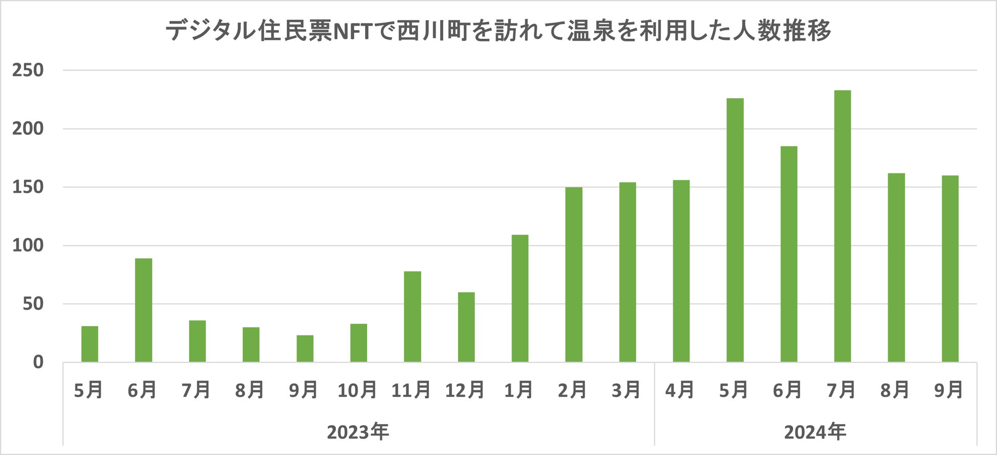山形県西川町は、日本最大級のNFTマーケット「HEXA(ヘキサ)」において、西川町の地方創生事業を協働する東武トップツアーズ株式会社と連携して発行したデジタル住民票NFTによってリアルに約1,915人(2024年9月末時点)を町に呼び込むことが出来ました。デジタル住民票NFTを持って町外から町に訪れて温泉を利用した人数は、下記グラフの通り着実に増加を続けており、町への誘客に成功し、地方創生2.0を実現に導いています。