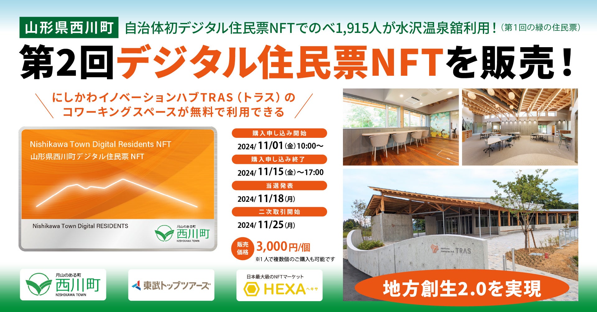 HEXA(ヘキサ)において、山形県西川町は東武トップツアーズ株式会社と連携して、にしかわイノベーションハブTRAS(トラス)のコワーキングスペースが無料で利用できるデジタル住民票NFT第2回を販売!