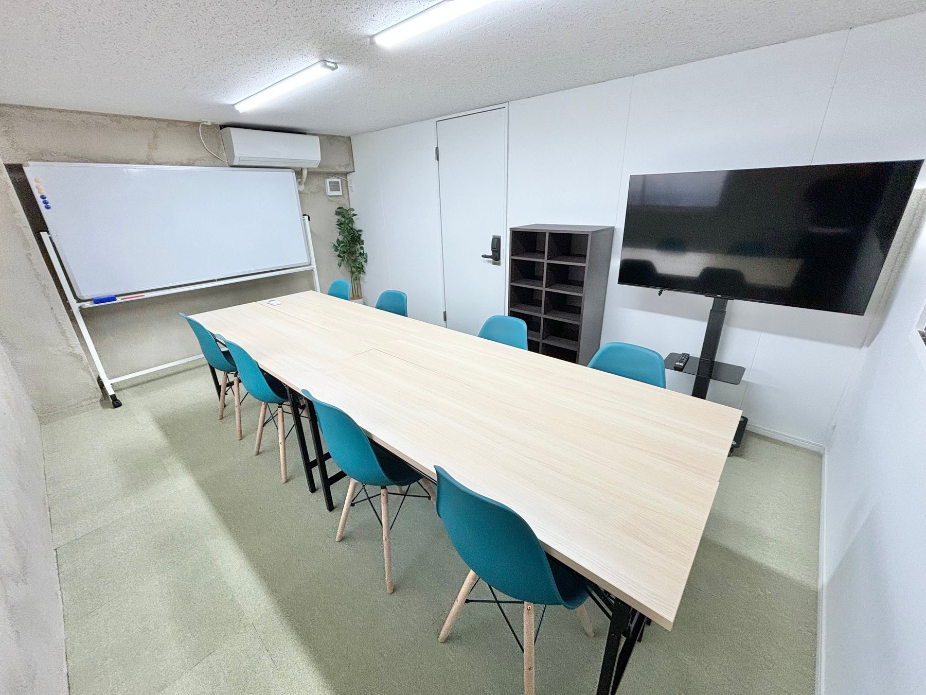 大型モニターとホワイトボード完備で、最大8名で利用可能な会議室(有料)。交流会やミニセミナーの開催も可能です。
