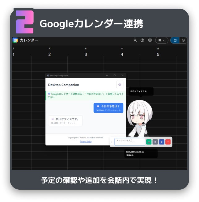 AIキャラクター事業を展開する株式会社Pictoria(東京都港区、代表取締役CEO:明渡隼人、以下 Pictoria)は、デスクトップAIアシスタント『ちょこざい』のクローズドβ参加者の募集を2025年9月3日(水)より開始します。ちょこざいはGoogleカレンダー連携、キャラクターとの会話体験などを組み合わせ、日々のPC作業を楽しく効率化します。
