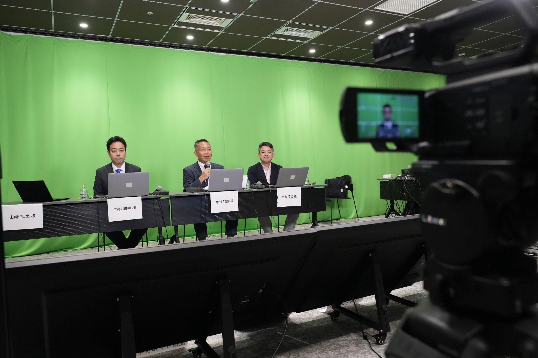・事前収録:IR DAYのメインコンテンツの一つである各事業ユニットのリーダーが行う事業説明パートは、正確かつ分かりやすく説明を行うべく、事前にスタジオで収録した録画映像をライブ配信しました。ブイキューブの収録専用スタジオで行っています。専用の機材が充実しており、上図のような背景合成なども可能です。