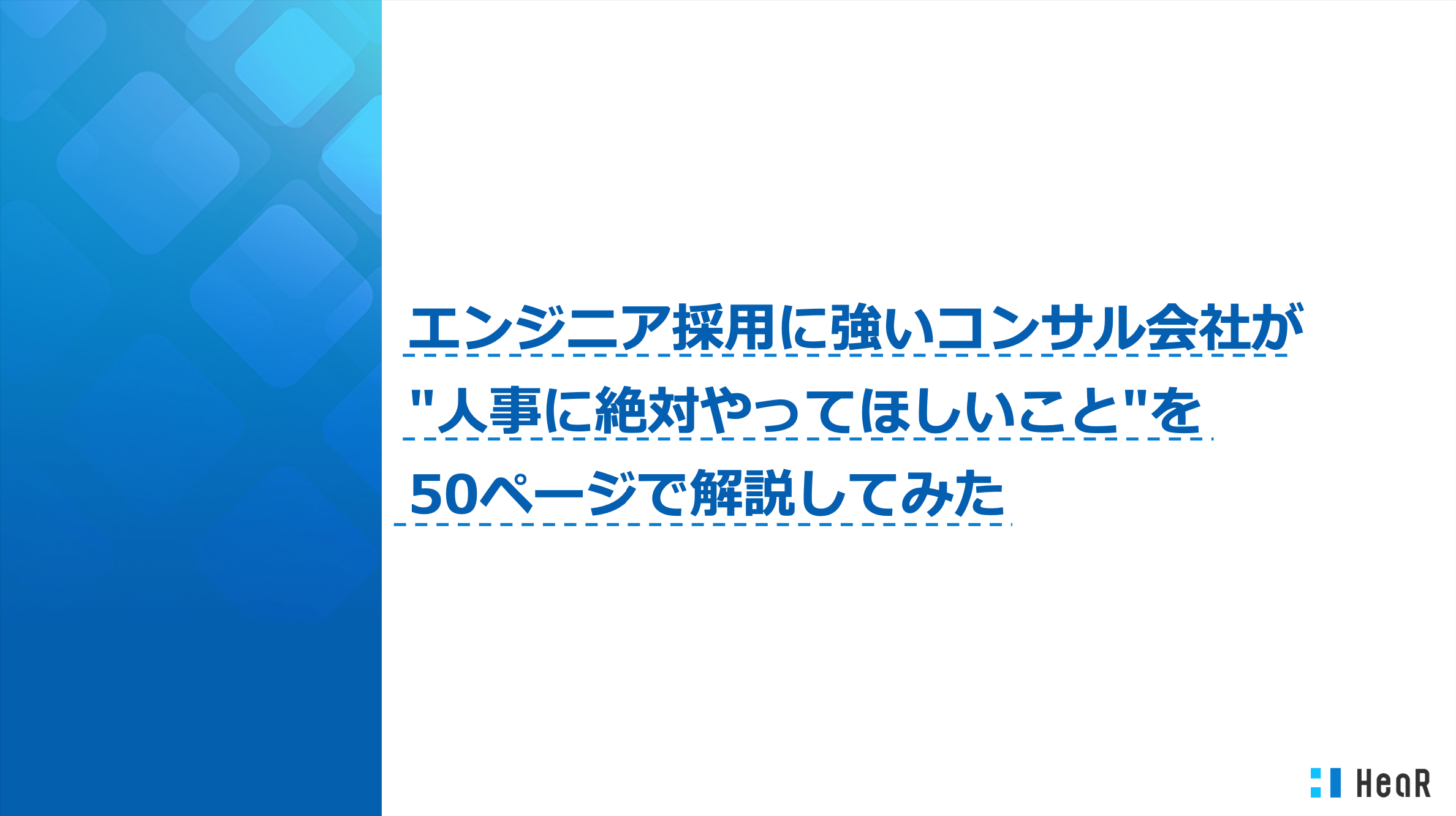 採用支援のHeaR株式会社(本社:東京都品川区、代表取締役CEO:大上諒、以下「HeaR」)は、エンジニアの人事・採用・経営者様向けに、採用力向上に役立つホワイトペーパー「エンジニア採用に強いコンサル会社が "人事に絶対やってほしいこと"を 50ページで解説してみた」を無料公開いたしました。