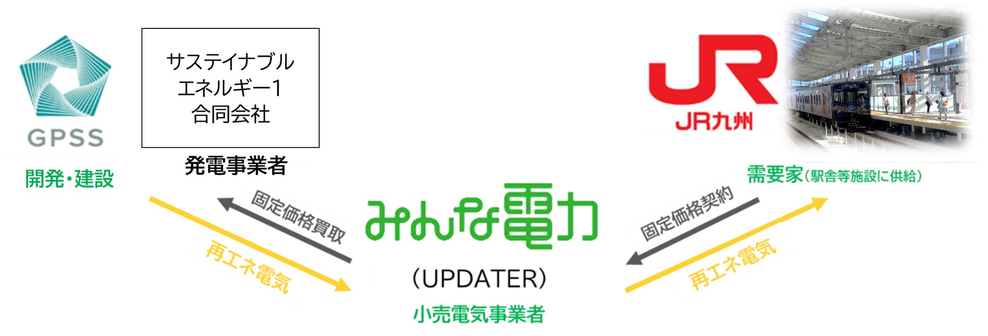 本取り組みは、GPSSが九州内(熊本県及び福岡県)で開発・建設した中小型の太陽光発電所の電気をUPDATERの脱炭素事業「みんな電力」が買い取り、再エネ指定の非化石証書の環境価値を組み合わせて、JR九州が保有する駅舎等へ再エネ電気の供給を行う計画です。今後も3者一同、引き続きCO2排出量ゼロの実現に向けて取り組みを推進するとともに、持続可能な社会の実現に貢献してまいります。