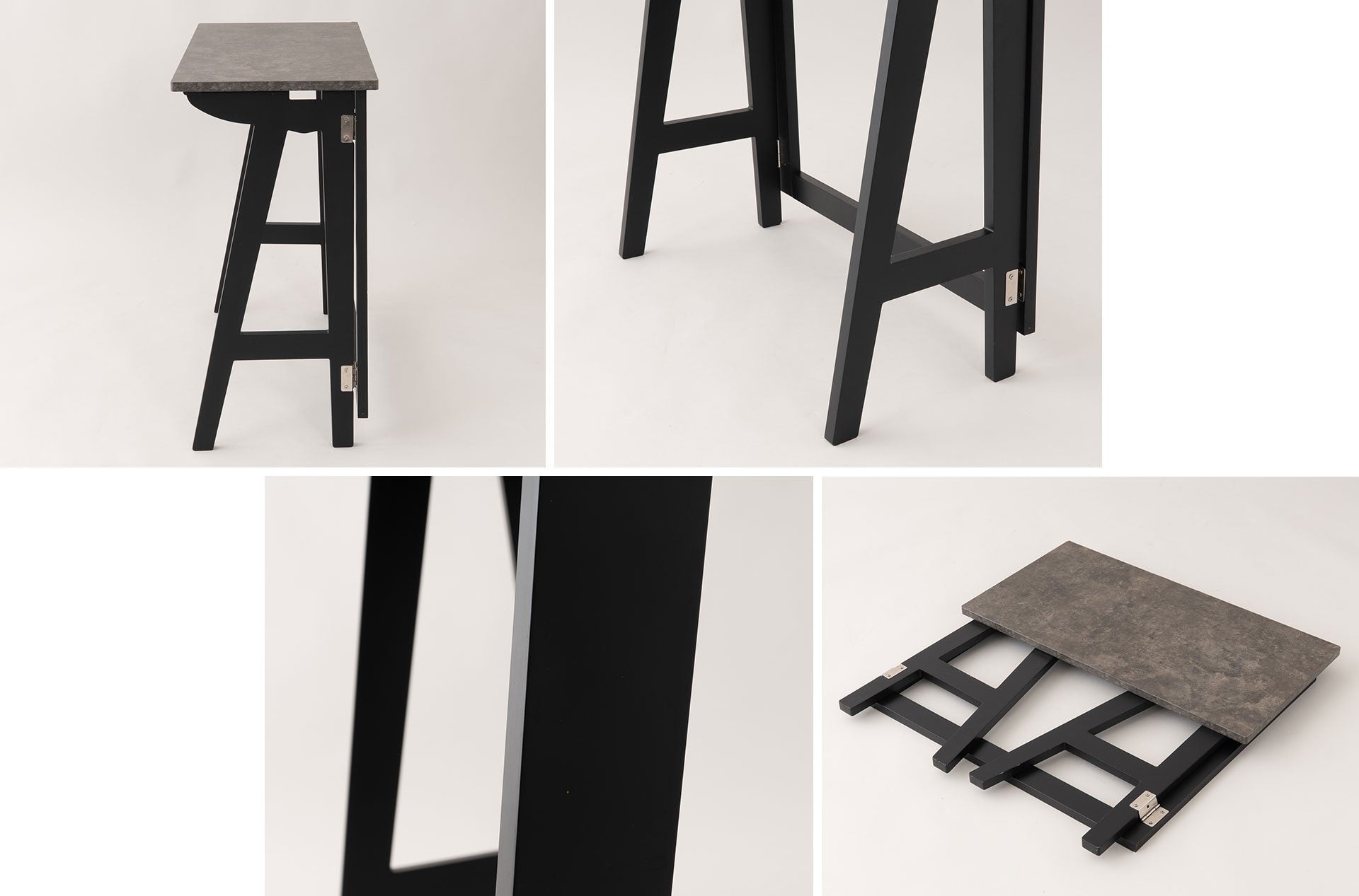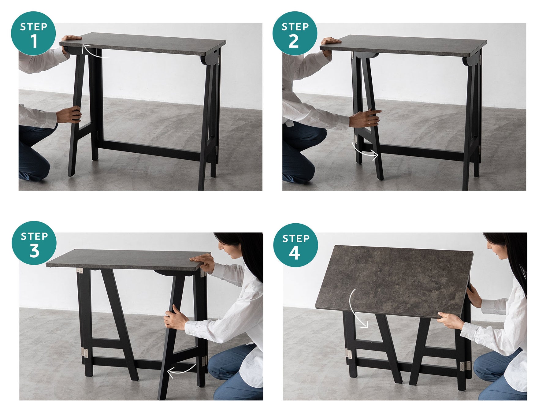 折りたたみは、天板を持ち上げながら左右の脚部フレームをたたみ、天板を下げるだけのシンプルな動作。複雑な手順や力を必要とせず、誰でも直感的に扱える構造です。「たたむ」家具を得意とするエムールの専門性を活かし、日常的な出し入れを前提とした、ストレスの少ない折りたたみ動作を実現しました。