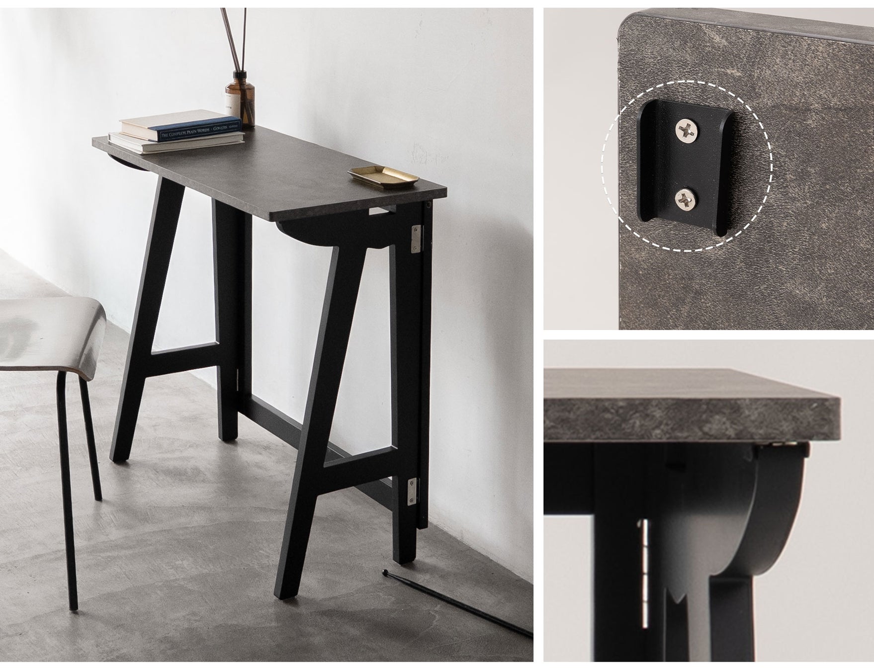角度をつけた天然木脚を採用し、折りたたみデスクにありがちな簡易的な印象を抑えました。使っているときはもちろん、立て掛けて収納している状態でも空間に馴染む佇まいです。