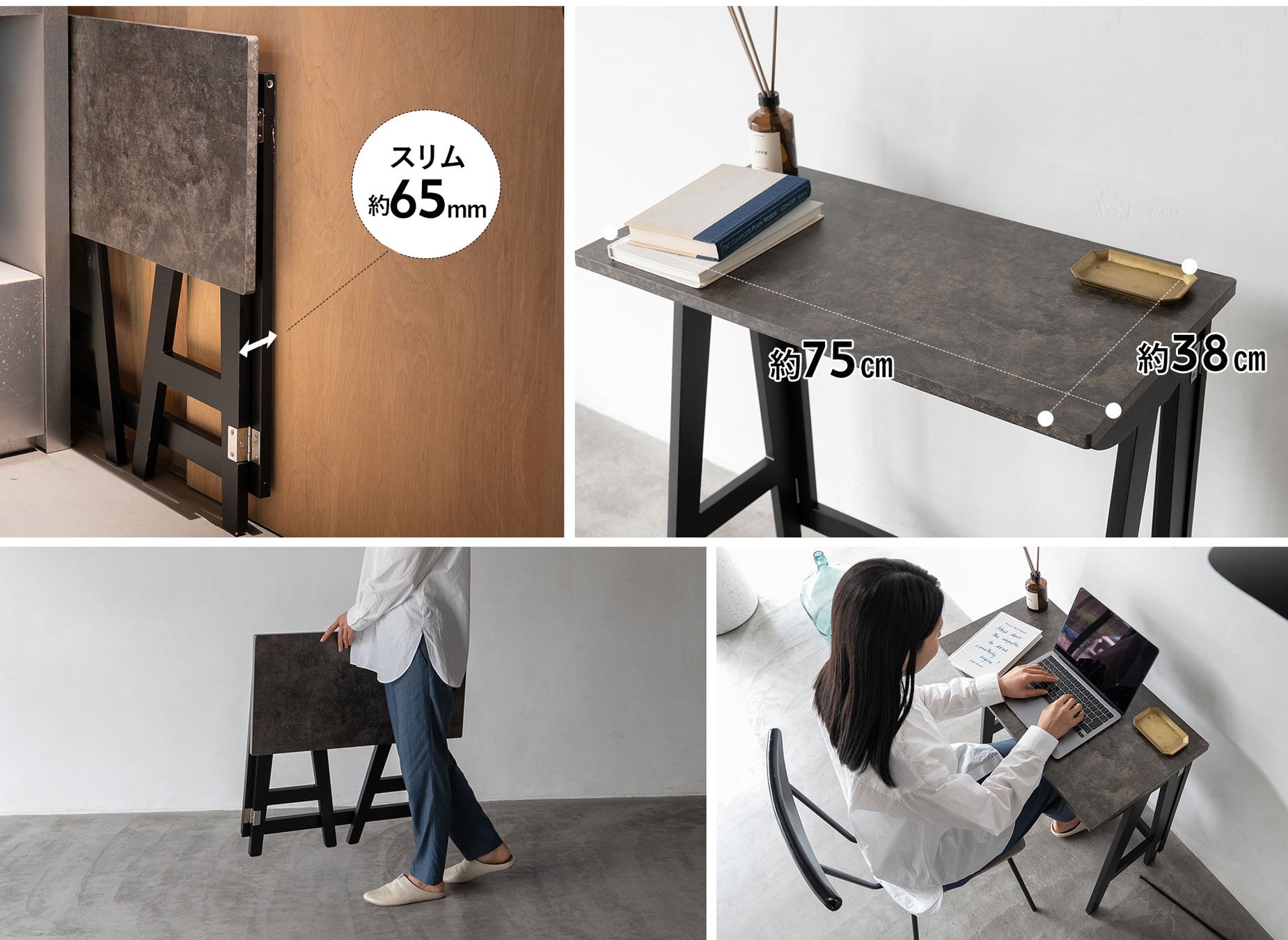 使う時は広く、使わない時は折りたたんでスッキリ。空間を無駄なく使える「スペースパフォーマンス」設計。収納時の奥行は、たたむデスクシリーズで最も薄いわずか約65mm。ちょっとした隙間に収納できます。また、非常にコンパクトながら広げた際の作業スペースは約75×38㎝と十分にあります。