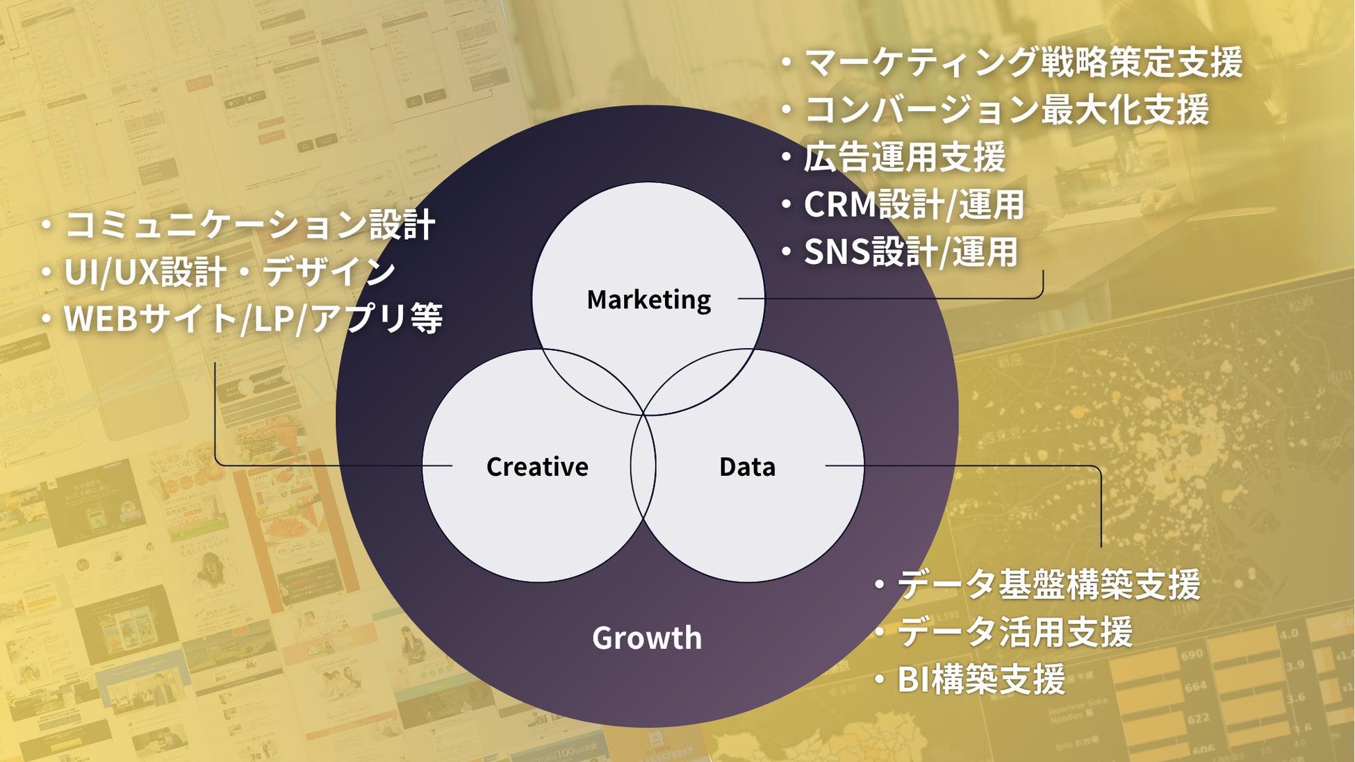 私たちは、「マーケティング」×「データサイエンス」×「クリエイティブ」で事業課題を解決し、グロースさせるマーケティング支援会社です。