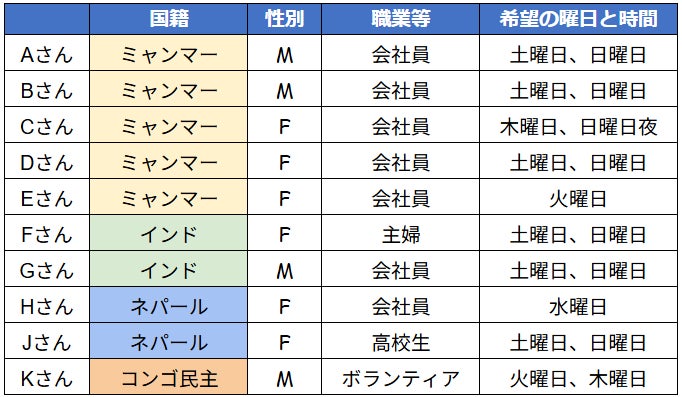 「日本語トークセッション」(2期)では、ミャンマー人、インド人、ネパール人、コンゴ民主人の合計10人がエントリーして皆さんの参加を待っています。全員が、身近な話題についてある程度会話ができる(日本語能力試験・JLPTでいうN3に相当する)日本語会話力のレベルです。日常的な会話の練習に慣れたら、実際に日本で話される日本語会話にチャレンジしてみてください。