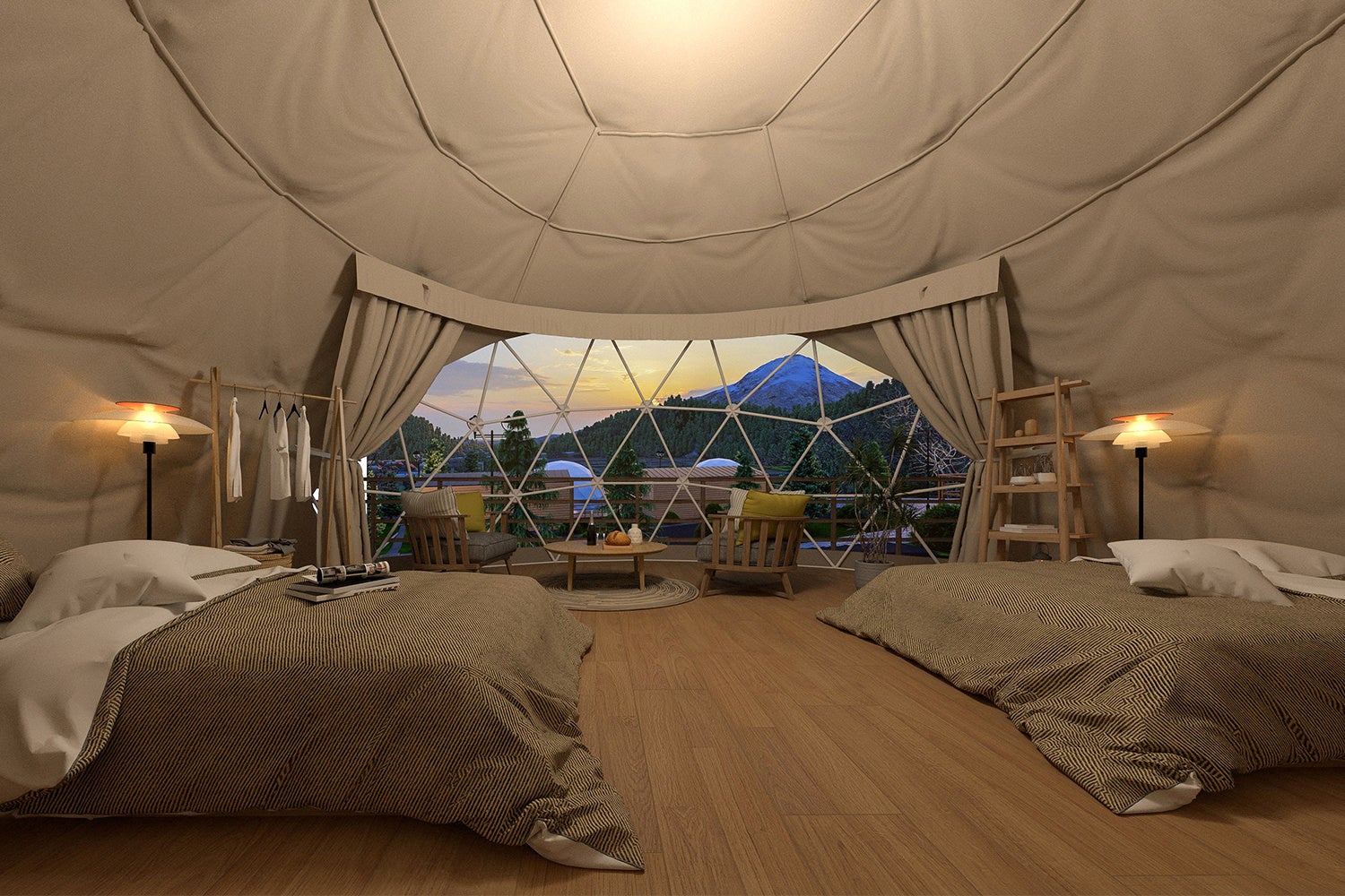 「グランファーム富士河口湖」では、一棟貸切スタイルの直径7Mの大型ドームテントにご滞在いただけます。
