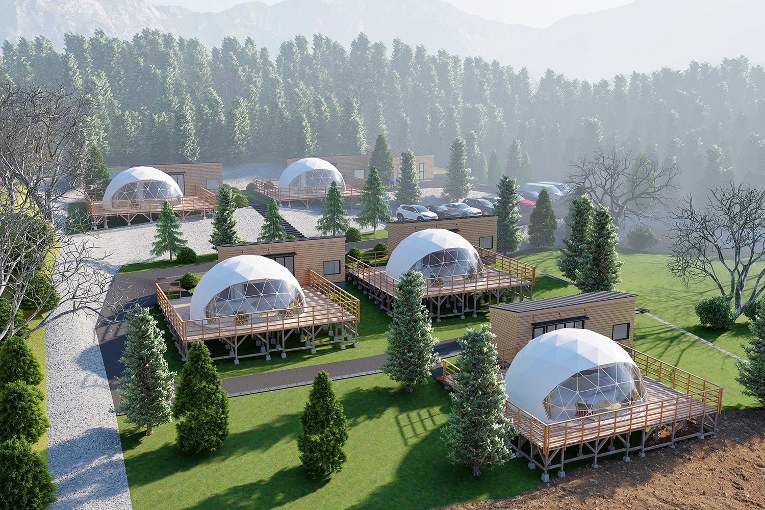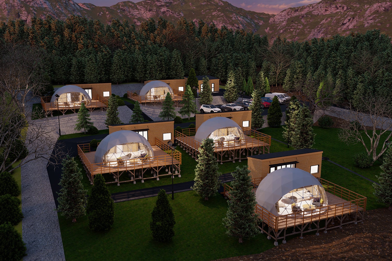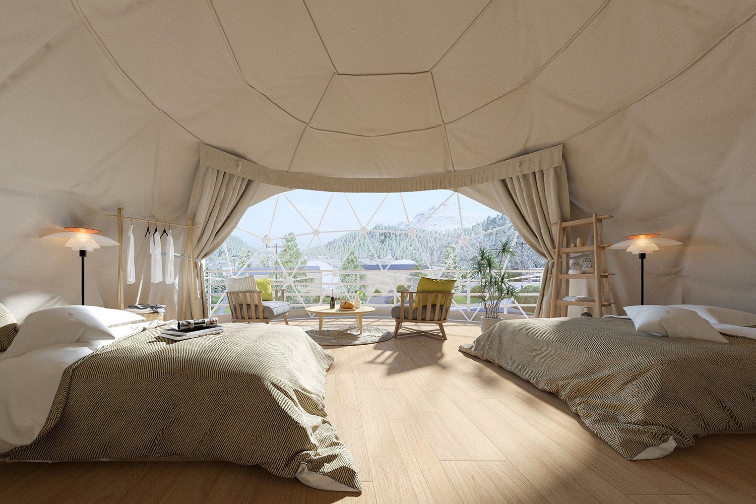 ②全棟が絶景のパノラマビュー。1棟貸切タイプの大型ドームテント