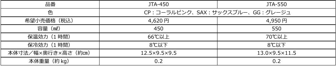 『サーモス 真空断熱マグカップ(JTA-450/550)』 仕様一覧
