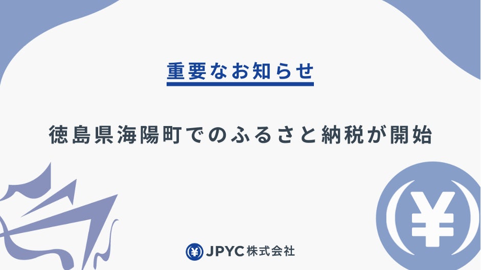 参考: 【国内初】日本円ステーブルコインJPYC決済でのふるさと納税が実現|JPYCが一般社団法人Disportと業務提携し徳島県海陽町で地方創生推進|JPYCのプレスリリース https://prtimes.jp/main/html/rd/p/000000069.000054018.html JPYC決済でのふるさと納税の開始延期のお詫びとお知らせ|JPYCのプレスリリース |