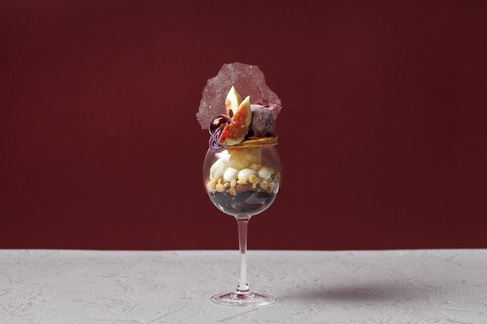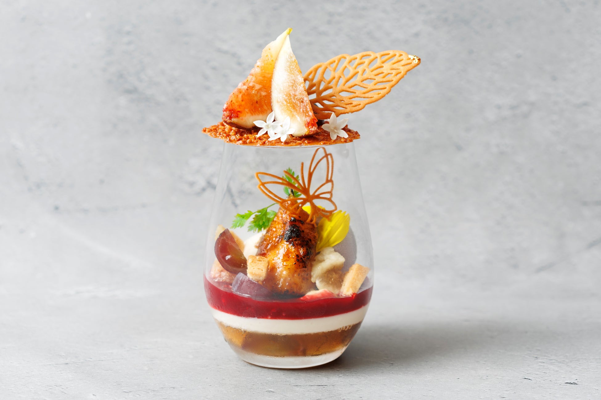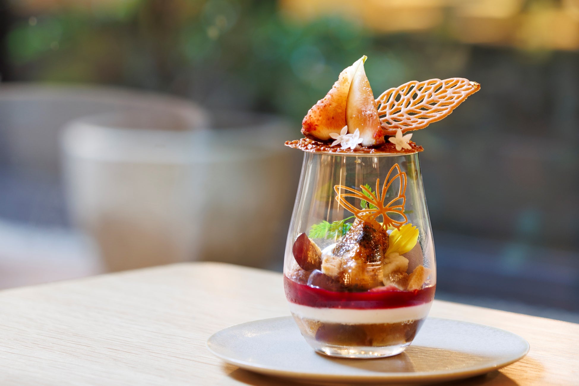 食物繊維やミネラルが豊富なイチジクを、フレッシュやブリュレで楽しめる秋限定パフェが登場。巨峰の甘酸っぱさとイチジクの優しい風味が絶妙なハーモニーを奏でます。底にアールグレイゼリー、ブランマンジェ、フランボワーズソースを重ね、アーモンドチュイルと2種の自家製ヴィーガンアイスをトッピング。蝶々が秋の庭を舞うような見た目も魅力的です。