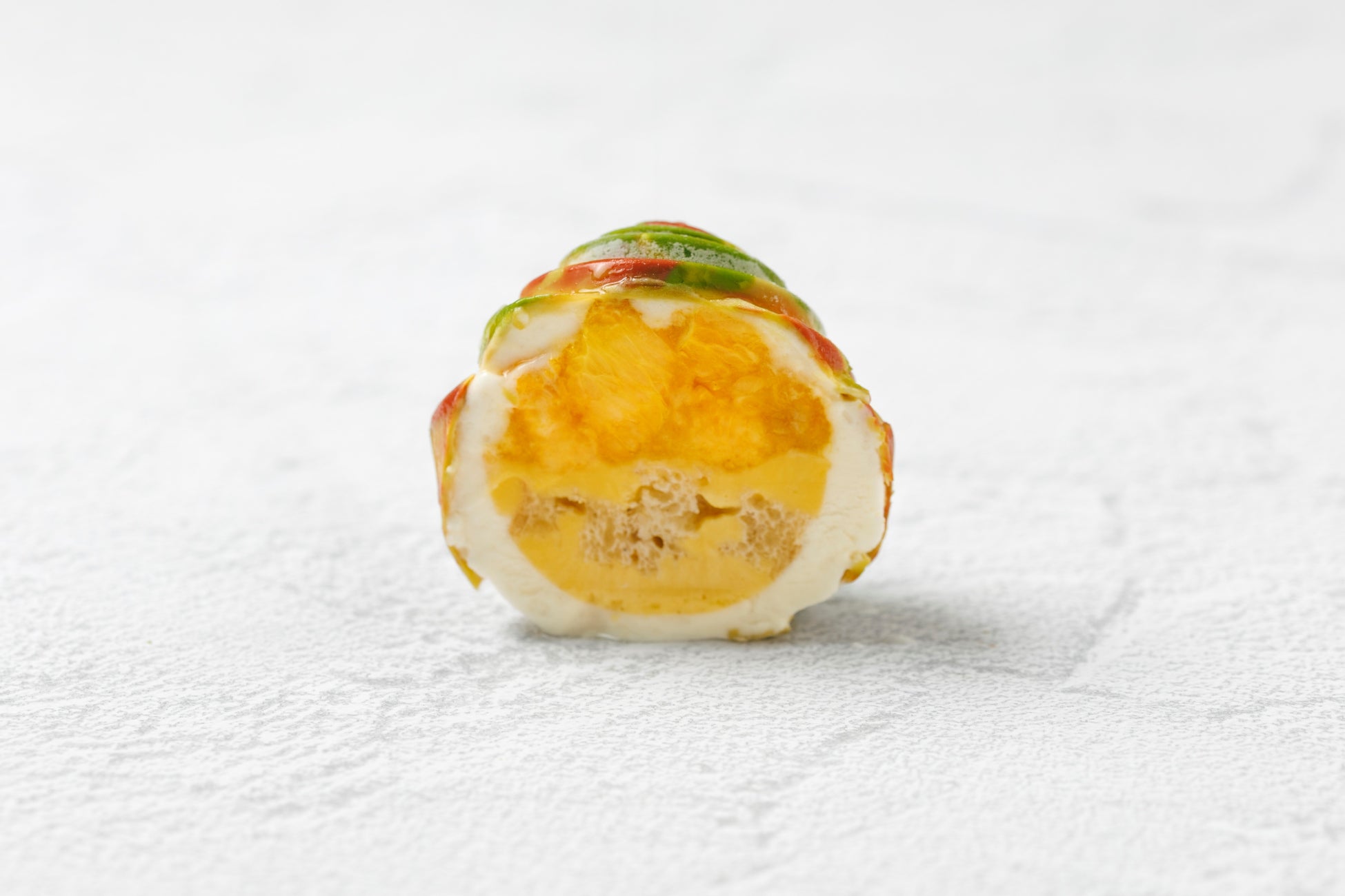 シェフ高木が父親から受け継いだ天然酵母バケットをアブサンやオレンジのシロップでサバラン風に仕上げ、中にはレモンのコンフィチュールとプラントベースのアングレーズソースを重ねています。全体を自社製のホワイトチョコレートを使用したレモン風味のムースで包み、色付く木々を表現したカラフルな表面が特徴です。姉妹ブランド「Sachi Takagi」の世界観とRAUのアートが融合した、感性をくすぐる「Mori」。芸術の秋にぜひご賞味ください。