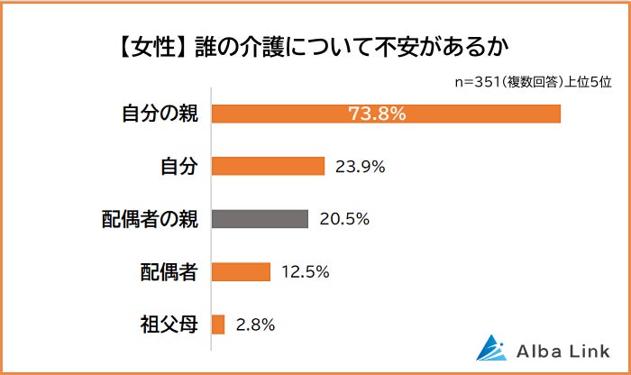 女性のほうが「配偶者の親」の介護を心配している傾向にあるとわかりました。