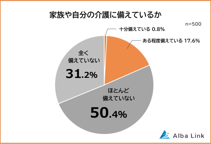 30代以上の男女500人に「家族や自分の介護に備えているか」を聞いたところ、「十分備えている」「ある程度備えている」と回答した人は合わせて18.4%でした。
