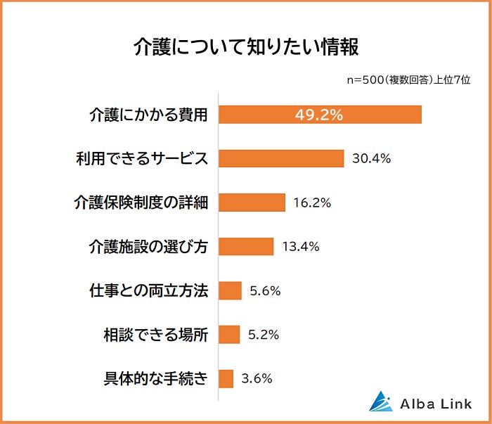 介護について知りたい情報で最も多かったのは「介護にかかる費用(49.2%)」でした。2位「利用できるサービス(30.4%)、3位「介護保険制度の詳細(16.2%)」、4位「介護施設の選び方(13.4%)」が続きます。