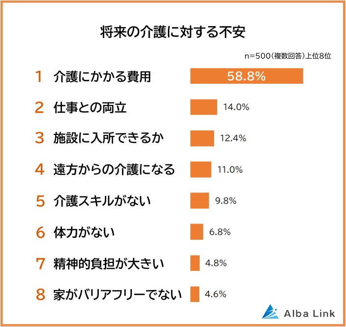 株式会社AlbaLink(本社:東京都江東区、代表取締役:河田 憲二)は、30代以上の男女500人を対象に「将来の介護に関する意識調査」を実施し、そのデータをランキングにしました。