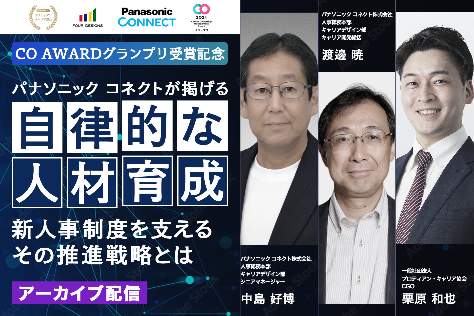 一般社団法人プロティアン・キャリア協会(東京都新宿区、代表理事:田中研之輔・有山徹、以下「当協会」)は、組織と個人のより良い関係構築と個人の主体的なキャリア開発を支援する団体です。この度7月12日(金)に開催したオンラインイベント「パナソニック コネクトが掲げる自律的な人材育成 -新人事制度を支えるその推進戦略とは-」のアーカイブ配信を開始したことをお知らせいたします。「キャリアオーナーシップ経営 AWARD 2024」にて最高賞を受賞したパナソニック コネクト株式会社(本社:東京都中央区、代表取締役 執行役員 プレジデント・CEO:樋口 泰行)の人事総務本部キャリアデザイン部シニアマネージャー 中島 好博氏、キャリア開発総括 渡邊 暁氏をお招きし、対談形式でお伺いしました。