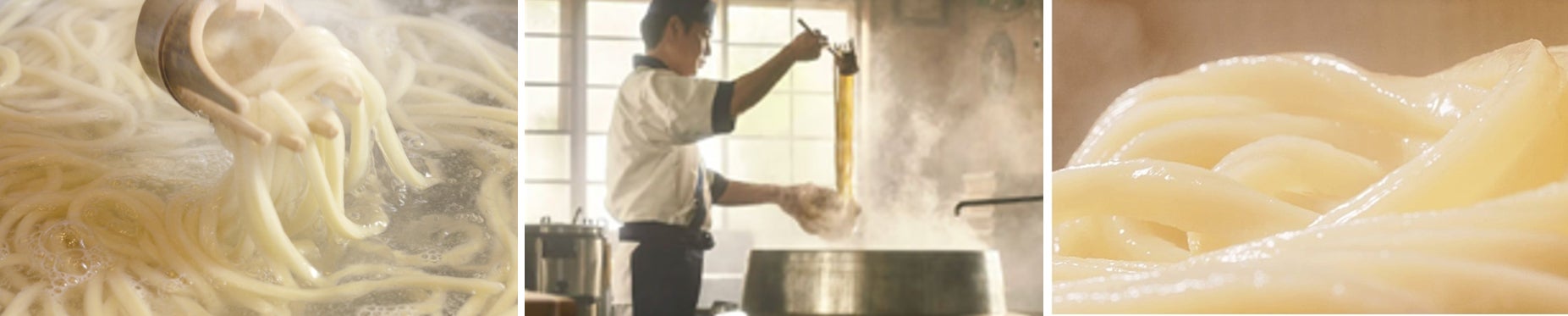 丸亀製麺では、すべての店で100%国産小麦、塩、水のみを使い、気候や材料の状態を見極め、熟成時間などの工程を調整しながら職人が製麺、調理を行い「打ち立て・生」のうどんをご提供しています。「釜抜き麺」は、打ち立て・茹でたてのうどんのおいしさをご堪能いただける、店内製麺を行っている丸亀製麺だからこそ自信を持っておすすめできる究極のお召し上がり方。水で締めないため、外はふわりと、中はもちっとした食感で、すする度にふわっと小麦の香りが広がります。