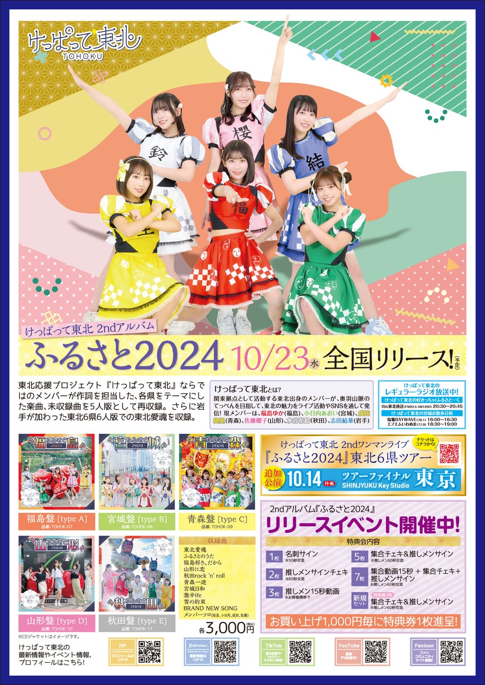 宮城、山形、と東北を盛り上げた翌日の10/14は、いよいよツアーファイナル追加公演 東京を新宿KeyStudioで開催!さらに10/23には2ndアルバム『ふるさと2024』を全国リリース!6人体制となった『けっぱって東北』から目が離せない!