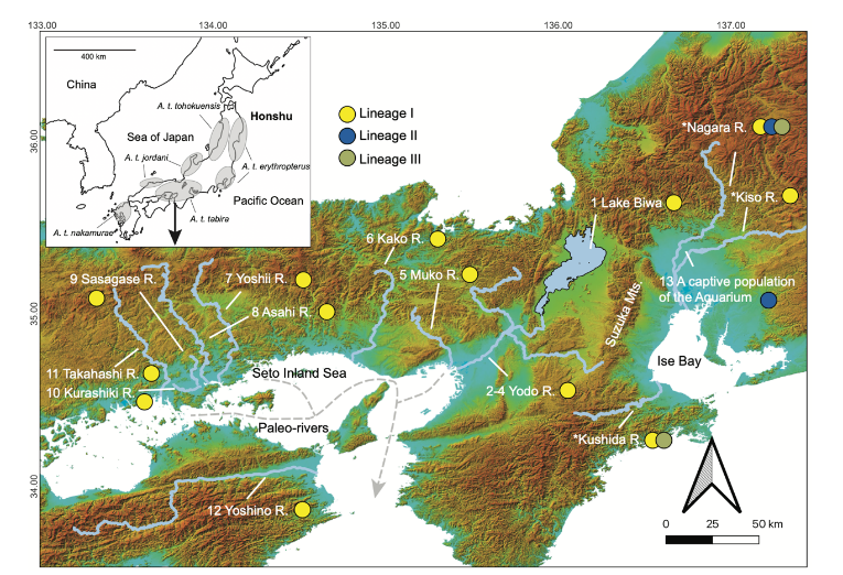 龍谷大学生物多様性科学研究センターの伊藤玄客員研究員と岐阜大学教育学部の古屋康則教授、三重県総合博物館の北村淳一学芸員、滋賀県立琵琶湖博物館の川瀬成吾学芸員・田畑諒一学芸員、NPO法人流域環境保全ネットワーク研究員らの研究グループは、ミトコンドリアDNA解析から、シロヒレタビラの国内の自然分布範囲にわたる系統地理および遺伝的集団構造を推定し、その分布パターンの要因に迫る研究成果をNature Conservation誌(Pensoft Publishers社)にて公表しました。