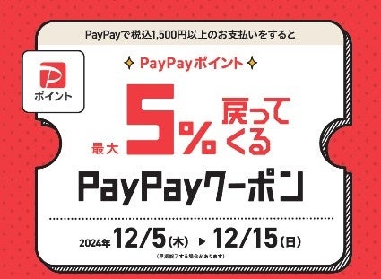 内容:事前にPayPayクーポンを取得し、期間中にPayPayで一度に税込1,500円以上の決済をすると、最大5%分のPayPayポイントを付与します