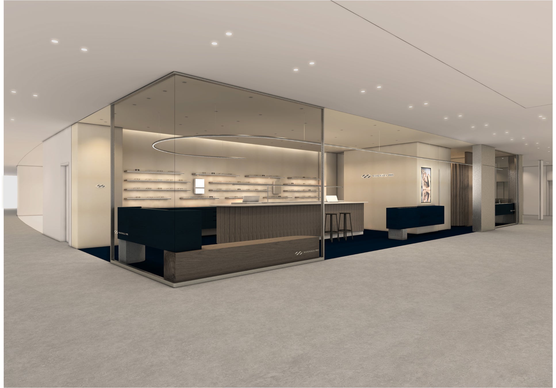 地下鉄心斎橋駅直結、新たなランドマークとして誕生するクオーツ心斎橋にオープン。「歴史・技術・品質の継承」をコンセプトに構成された店内は、MASUNAGAの魅力を体験できる空間になります。昭和天皇への献上品の復刻版としてリリースされた"G.M.S.999"のシンプルかつ美しいディティールを落とし込んだオリジナル照明がシンボリックに店内を旋回しています。また、存在感のあるディスプレイシェルフは、あえて数を絞り余白を持ってフレームが並ぶ贅沢な仕様に。